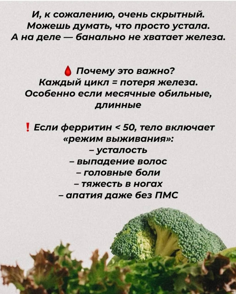 ПОСТОЯННО НЕТ СИЛ!!! Анемия - главный враг женской энергии и красоты ✔️ Многие женщины сталкиваются с проблемой низкого уровня ферритина (железа), которая влияет не только на здоровье, но и на общее самочувствие. Низкий уровень железа может привести к хронической усталости, слабости, снижению иммунитета и ухудшению состояния кожи, волос и ногтей. Однако важно понимать, что проблема анемии редко решается простым приемом препаратов железа. Часто причина кроется глубже: неправильная диета, нарушение всасывания питательных веществ, хронические заболевания или даже стрессовые ситуации. Поэтому подход к лечению должен быть комплексным и включать следующие аспекты: - Правильное питание: увеличение потребления продуктов, богатых железом (мясо, рыба, яйца, бобовые). - Витаминотерапия: прием витаминов группы B, витамина C и фолиевой кислоты для улучшения усвоения железа. - Регулярные обследования: контроль уровня гемоглобина и ферритина, консультация врача-гематолога. - Здоровый образ