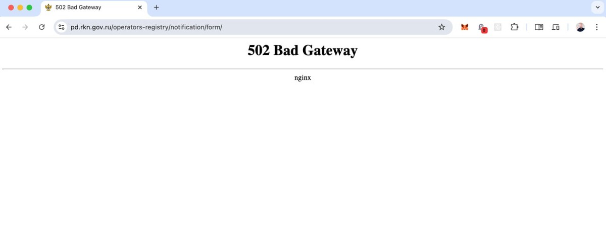 Роскомнадзор, а вам не кажется, что это позор? Решил подать нашумевшее уведомление в РКН до 30 мая, а то там по попе атата сделают, если не уведомить их, что ты обрабатываешь персональные данные Ну блин 502 ошибка для такого сервиса - это прям крайне печально конечно. Жму на их ссылку подать заявление и вот такое вижу 🥹