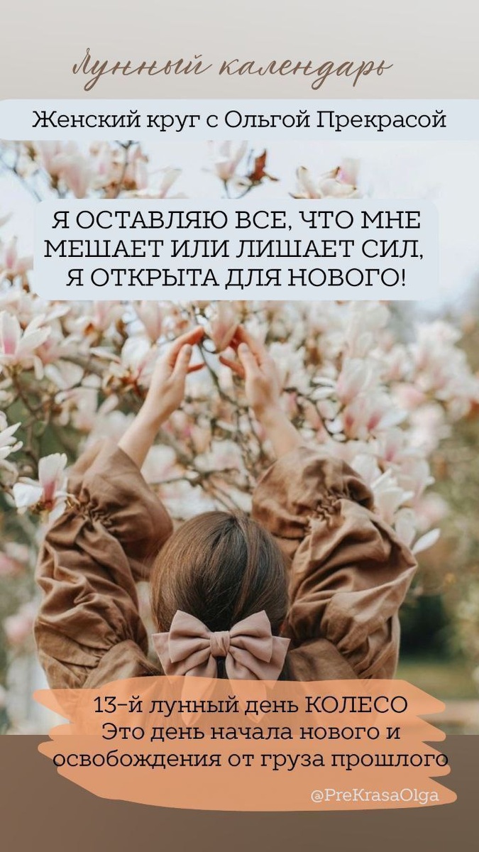 °• МЕДИТАЦИЯ 13 ДНЯ ЛУНЫ •° Медитация КОЛЕСО Колесо символизирует жизненный цикл, перерождение и обновление, благородство, изменчивость материального мира. Колесо — это также время, судьба или карма, неумолимо и непрестанно вращающееся колесо сансары. 🩷 Перед вами колесо времени. Его вращение освобождает от груза прошлого, уносит прочь все ошибочное, ненужное, больное и потерявшее смысл. Вы вращаете колесо против солнца, оставляя позади прожитое, благодаря исчезающие дни, эмоции, вещи, людей за весь опыт, который они вам принесли, и каждый поворот колеса освобождает вас и в вас место для нового, уносит прошлое и дает открыться будущему. Когда освобождение закончено, остановите колесо судьбы, сделайте вдох и на выдохе начинайте вращать его по ходу Солнца. С каждым оборотом прикрепляйте к волшебному колесу ваши мечты, цели, планы, новые знакомства и желаемые обстоятельства. Колесо несет вас в будущее, к новым открытиям, будьте готовы двигаться с той скоростью, которую вы задал