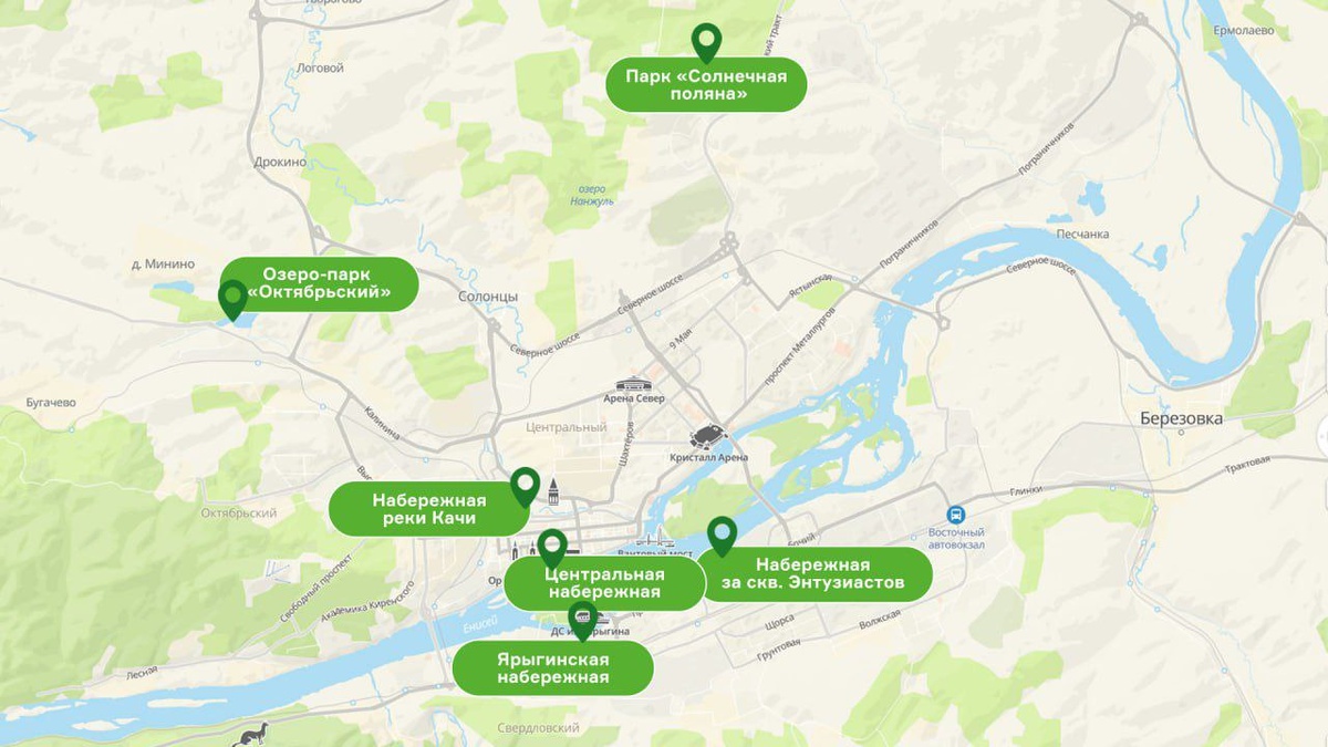 ▶️ Где будут «ЯРкие БЕРЕГА» этим летом? Организаторы сделали карту проекта. Каждые выходные с 1 июня по 30 августа на этих локациях будут проходить летние мероприятия. 📍Центральная набережная 📍Ярыгинская набережная 📍Набережная за сквером Энтузиастов 📍Парк «Солнечная поляна» 📍Озеро-парк «Октябрьский» 📍Набережная р. Кача