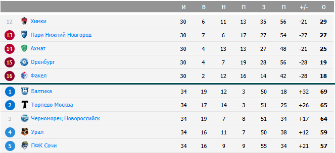 3) По спортивному принципу напрямую пробились в РПЛ Балтика и Торпедо. В зоне стыков финишировали Черноморец и Урал.
