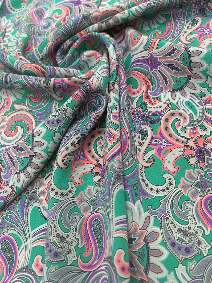Шелк многоцветный- на изумрудном фоне разбросаны серо-розовые и лавандовые пейсли , ткань не просвечивает