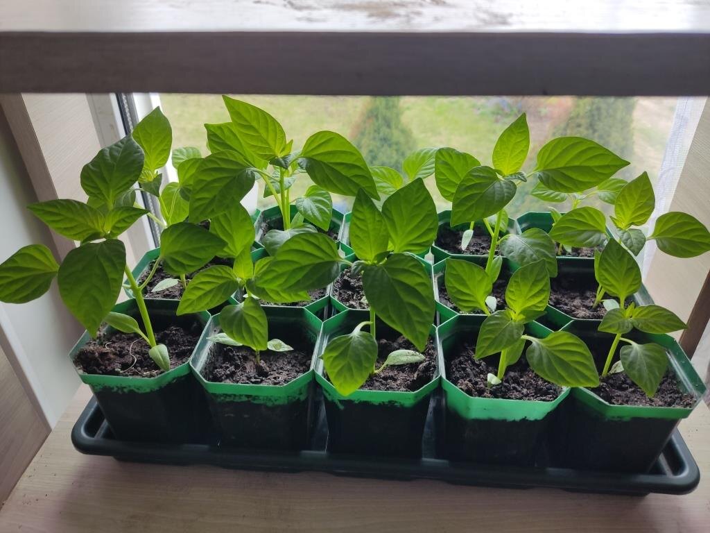 Почему именно так? В чем преимущества данной подвязки? История циклична, это видно даже на том как мы подвязываем перец. Шарахаемся из стороны в сторону, но в итоге снова возвращаемся к прежнему способу подвязки на двойную «бесконечность». Посмотрите, на верхнем фото — моя рассада перца в апреле. Тогда она ещё не знала, что ей предстоит половину мая мерзнуть в теплице, дожидаясь погоды и окончания ночных заморозков. И не знала, что днем её будет выжигать ненормальное для мая солнце, которое вынуждало Хозяйку поливать саженцы по два раза в день. Если вы новичок и мечтаете выращивать перец без подвязки — ничего не получится. Он имеет очень хрупкие и ломкие побеги. А под тяжестью урожая — обязательно будет наклоняться в какую-то одну сторону. Так не бывает, чтобы перчики росли равномерно и пропорционально со всех сторон, соблюдая баланс и равновесие. Хотя было бы неплохо. Но для этого у растений перца должен был бы быть ствол (как у дерева), а не центральный хрупкий побег. Мда... Что-то т