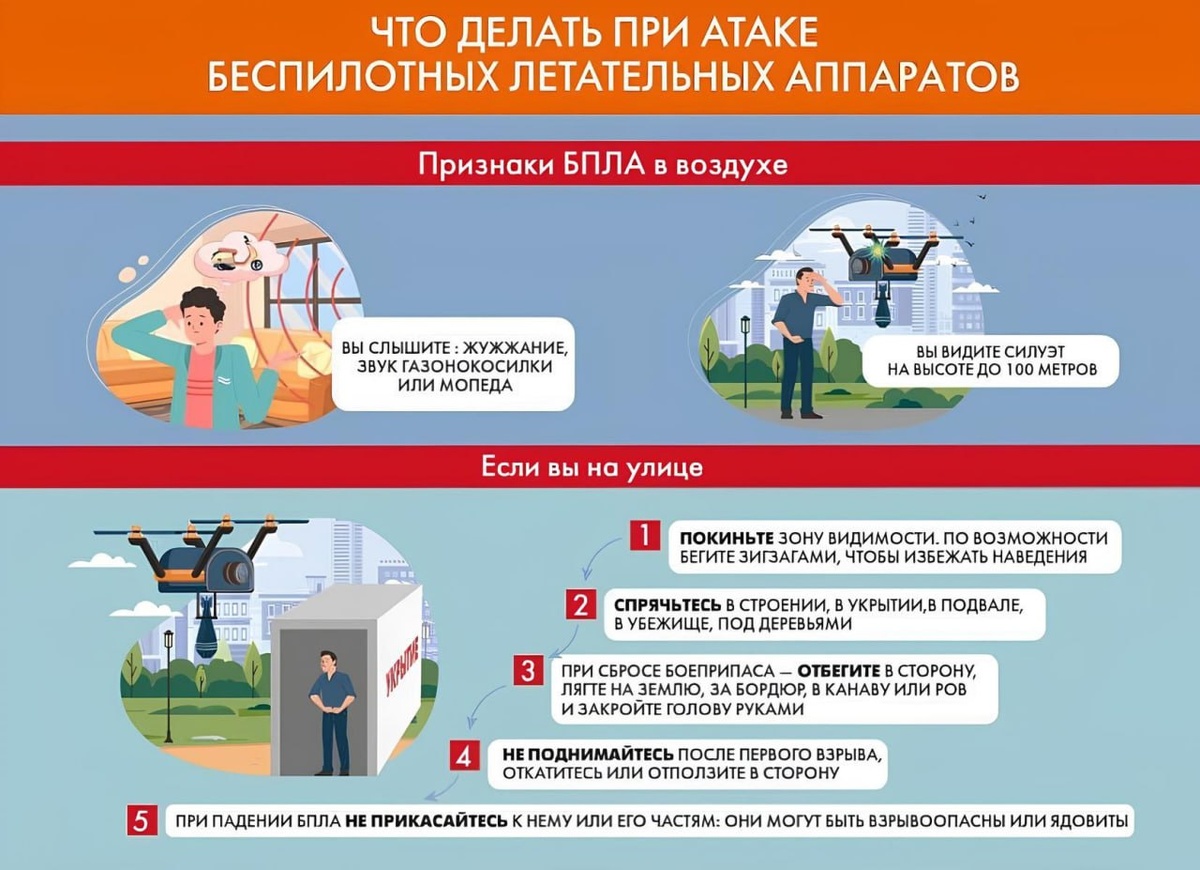 Прежде всего, не паниковать. Что делать при атаке беспилотников Ранним утром 28 мая Зеленоград подвергся атаке вражеских БПЛА. Зеленоградский «Жилищник» поделился инструкцией – что делать в таких случаях. Если вы видите летящий дрон и слышите характерное жужжание, надо покинуть открытое пространство и найти укрытие – в помещении, подвале, под деревьями, в канаве. В здании надо отойти от окон и не пользоваться лифтом. При сбросе боеприпаса надо лечь на землю и закрыть руками голову. Старайтесь отползти в сторону. Не прикасайтесь к обломкам дрона, они могут взорваться. Если вы в личном или общественном транспорте, надо его покинуть и найти укрытие. Если укрытия нет, надо просто бежать из зоны видимости беспилотника. МЧС также напоминает, что при обнаружении дрона надо позвонить в полицию или МЧС: 102 или 112. Но нельзя пользоваться мобильной связью в непосредственной близости от беспилотника. Если вы сделали фотографии или видеозаписи БПЛА, передайте их сотрудникам полиции. Не выкла