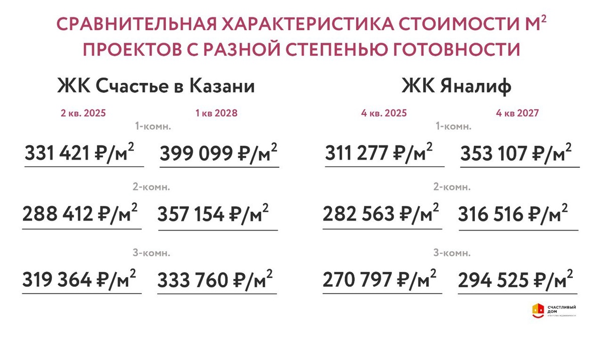 например кв.м однокомнатной «Счастья в Казани»- 331 000₽/кВ.м сейчас и 399 000₽/ кВ.м обойдётся вам квартира на «котловане»