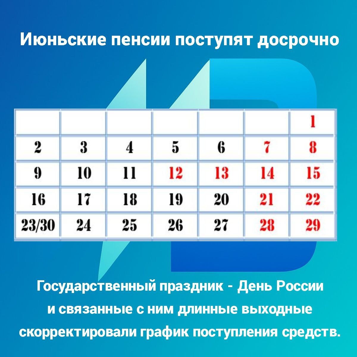 В июне 2025 года пенсионеры, дата выплаты пенсии у которых приходится на период с 12 по 15 число, получат перечисления досрочно. Такой порядок введен из-за длинных выходных, связанных с празднованием Дня России.