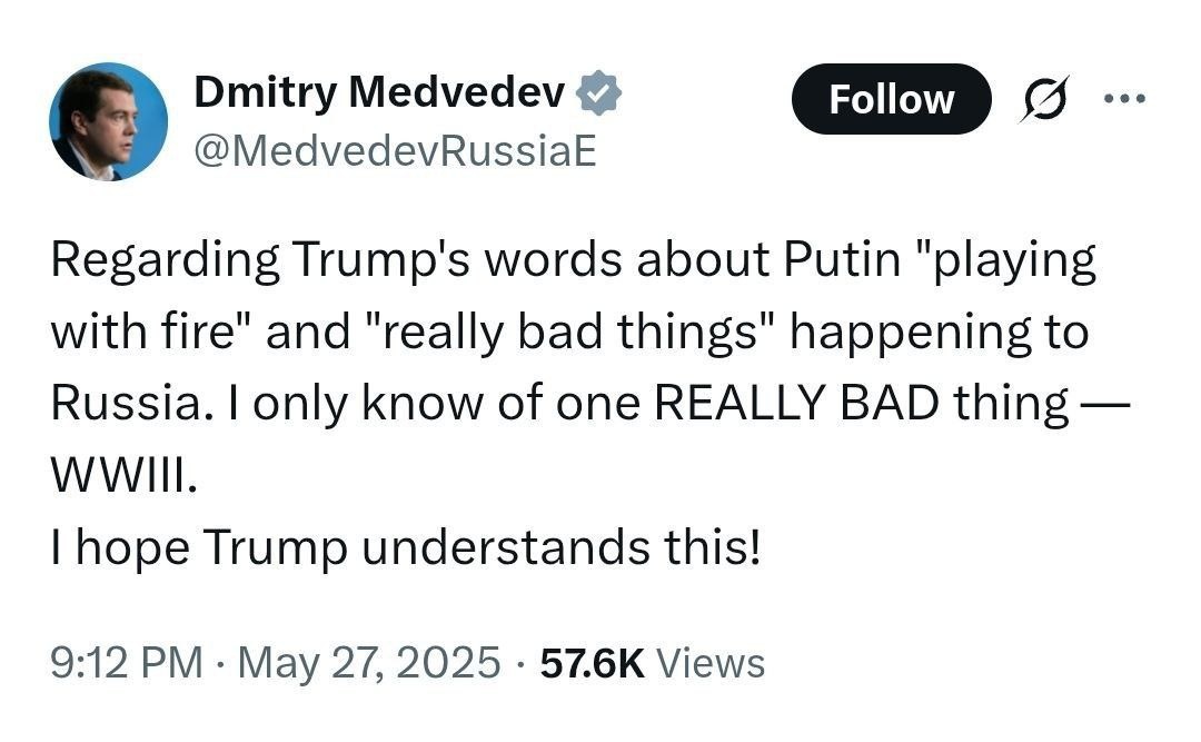 Медведев наехал на Трампа и решил пригрозить ему Третьей мировой: «Что касается слов Трампа о Путине, который «играет с огнём», и о том, что с Россией могут случиться «очень плохие вещи». Я знаю только одну ДЕЙСТВИТЕЛЬНО ПЛОХУЮ вещь — Третью мировую войну. Надеюсь, Трамп это понимает!», — заявил Медведев. Однако, Медведеву прилетела ответка: у Трампа резко отреагировали на его угрозы третьей мировой. Спецпосланник президента США по вопросам Украины Кит Келлог назвал писанину Медведева «неудачным и безответственным комментарием», который неприемлем для современного государства: «Президент Трамп работает над тем, чтобы остановить эту войну и прекратить убийства. Мы ожидаем получения российского Меморандума (условий соглашения), который вы обещали неделю назад. Прекратите огонь сейчас», — заявил Келлог.