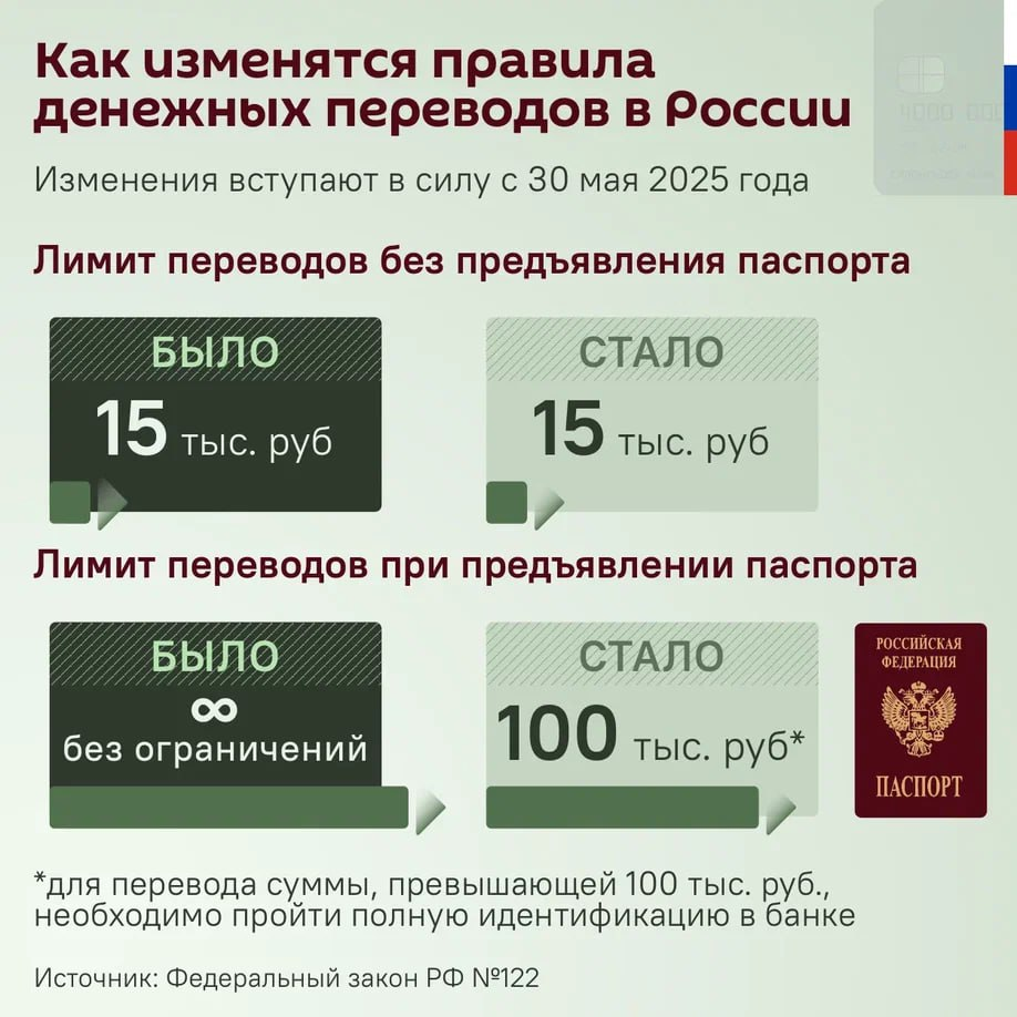 ▪️ Введение лимитов не коснется переводов с карты на карту или через СБП (это операции между клиентами банка с уже открытыми в нем счетами). Новые правила будут регулировать только переводы без открытия счета в банке и с электронных кошельков без полной идентификации человека. ▪️ Чтобы перевести более 100 тыс. рублей, нужно открыть банковский счет и пройти полную процедуру идентификации личности (Ф.И.О.; гражданство; дата рождения; реквизиты документа, удостоверяющего личность; данные документов, подтверждающих право иностранного гражданина или лица без гражданства на пребывание (проживание) в РФ; адрес местожительства или местопребывания; ИНН; СНИЛС и контактная информация). ▪️ При необходимости или подозрительной транзакции банк может запросить у клиента детальную информацию о переводе – о его цели или получателе. Нововведение направлено на борьбу с отмыванием денег и незаконным выводом их из страны.