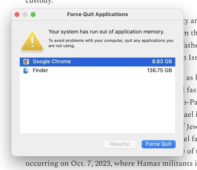 А если серьезно, то если вы столкнулись с похожим сообщением, то скорее всего одно или несколько приложений впали в клинч и выедают всю оперативную память вашей машины. На данном этапе можно попробовать прицельно завершить проблемное приложение, или перезагрузить Мак целиком.