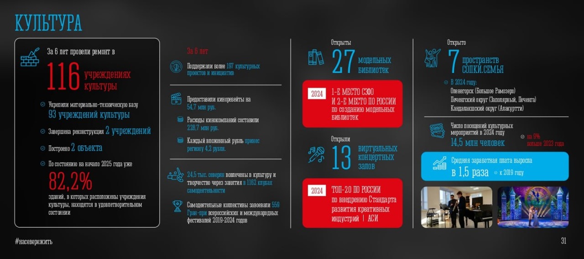 Культура. По состоянию на начало 2025 года 82,2% задний, в которых расположены учреждения культуры, находятся в удовлетворительном состоянии. #ОтчётГубернатора на ❄ «Арктическом Обозревателе»