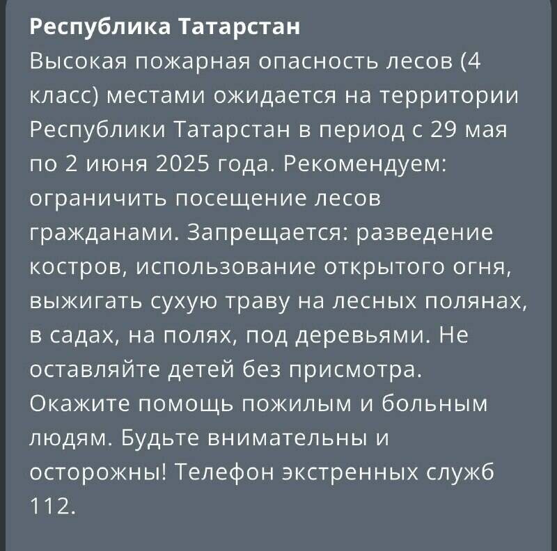 МЧС России предупредило жителей Татарстана о высокой пожароопасности лесов в ближайшие дни. С 29 мая по 2 июня в республике ожидается высокая пожарная опасность лесов (4-й класс). В МЧС напомнили о том, что запрещено разводить костры, использовать открытый огонь, выжигать сухую траву на полях, в садах и под деревьями. Нельзя бросать непотушенные спички или сигареты и использовать в лесу различные пиротехнические изделия.