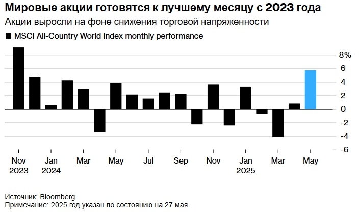 Индекс MSCI All-Country World Index в мае вырос на 5,7%, что стало лучшим показателем с ноября 2023 года. Это произошло на фоне ослабления торговой напряжённости в мире. Однако на прошлой неделе аппетит к риску снизился из-за опасений инвесторов относительно бюджетного дефицита в США.