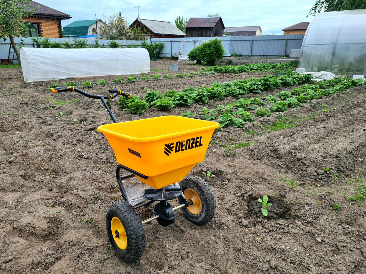 Тест механической сеялки DENZEL произведем на огороде с россыпью удобрений.