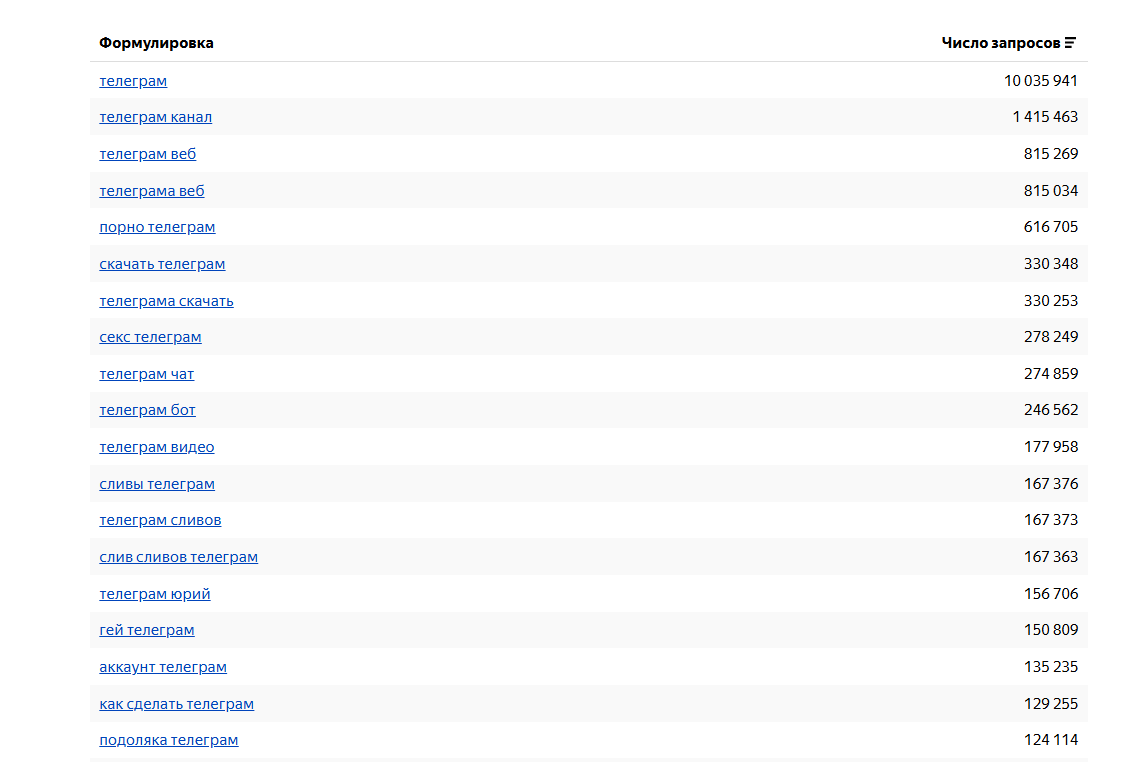 Ещё немножко про мессенджеры. Уже более 20% всего трафика Телеграм-каналов приходит из браузера. В Яндексе Telegram-каналы чаще всего появляются в топ-10 по выдаче, а в Google - на позициях от 20 строчки. В самом Яндексе сообщили, что в 2025 году пользователи ежедневно осуществляют более 3 млн. переходов из браузера в мессенджер. И вот как бы вроде это и здорово, но с другой стороны мы не знаем по каким запросам пользователи переходят в мессенджер. Ищут конкретный канал? Типа “телеграм Климчуковы”? Или они просто что-то ищут? Навскидку придумать запрос без упоминания названия канала, но чтобы выдача показала телеграм, не получилось. “70% переходов совершаются на конкретный контент каналов, и только 30% составляют полунавигационные и навигационные запросы” - сообщает Яндекс. Что такое навигационные запросы в данном случае? Предполагаем, что 70% на конкретный пост, а 30% в канал, на последний пост как бы. Ладно, давайте посмотрим по вордстат, что пользователи ищут с упоминанием телеграм
