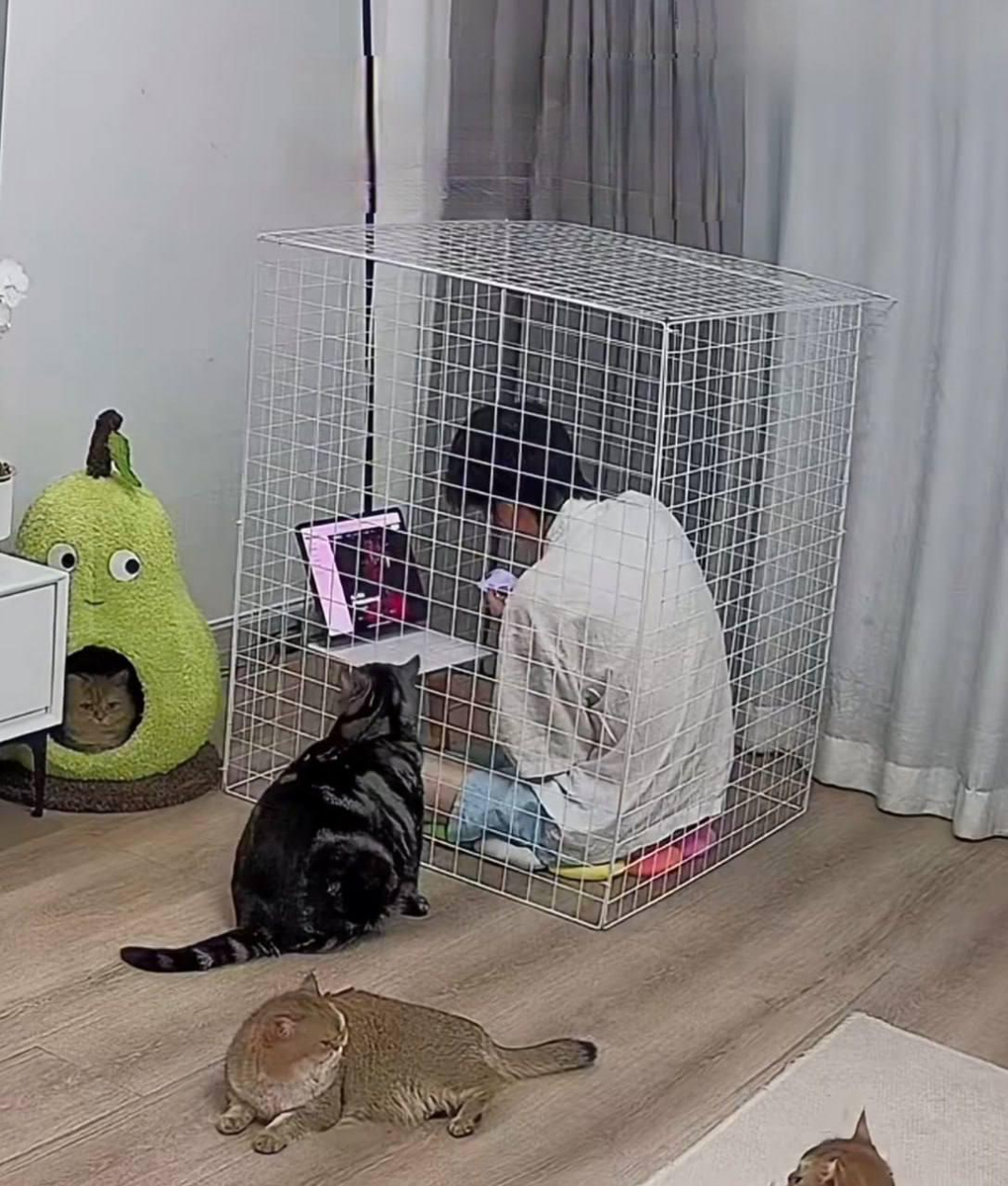 Он купил большую клетку, предназначенную для крупных собак, и установил её в углу комнаты. Внутри — стол, ноутбук, стул и наушники. Теперь Игорь проводит в клетке по 6–8 часов в день, чтобы работать без помех. Кошки пытаются пробраться внутрь, царапают прутья и мяукают, но Игорь остаётся непреклонным. «Это мой единственный способ сосредоточиться», — говорит он. Клетка запирается на замок, чтобы никто не открыл её случайно, пока он в наушниках.