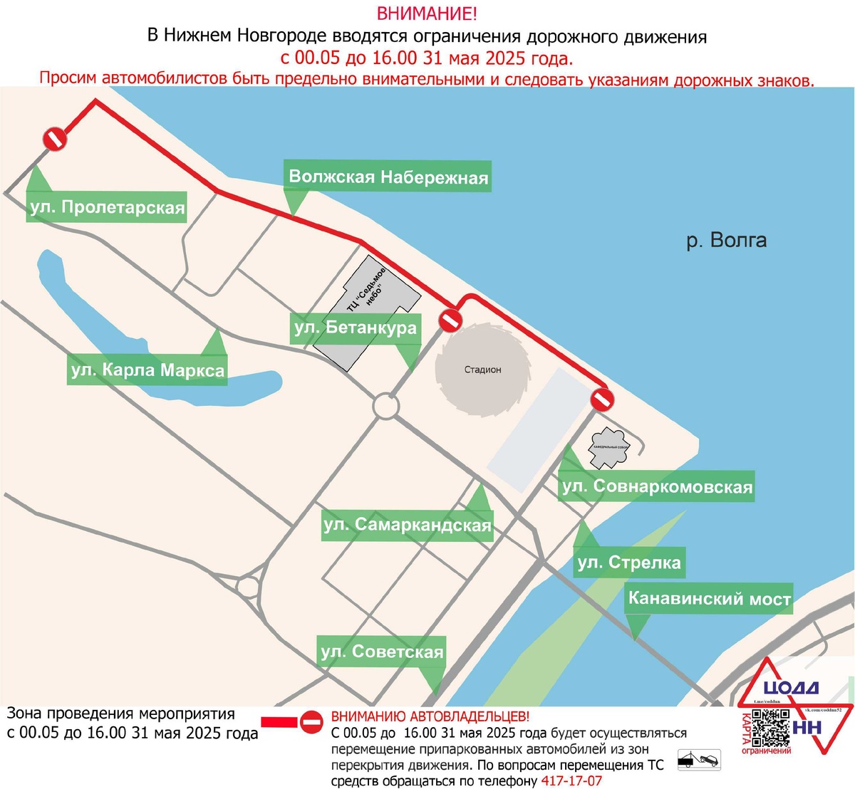 31 мая с 00:05 до 16:00 в районе Мещеры в Нижнем Новгороде перекроют движение транспорта в связи с проведением спортивного забега. Ограничения коснуться следующих участков дорог: Волжская набережная (от ул. Пролетарской до ул. Совнаркомовской), ул. Совнаркомовская (от Волжской набережной до ул. Стрелка), ул. Бетанкура (от Волжской набережной до ул. Самаркандской):