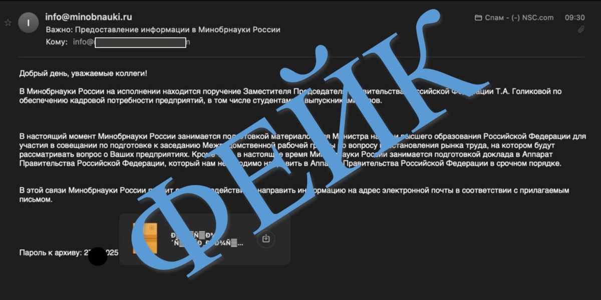 ❗️Мошенники осуществляют рассылку поддельных электронных писем от лица Минобрнауки России с прикрепленным архивом