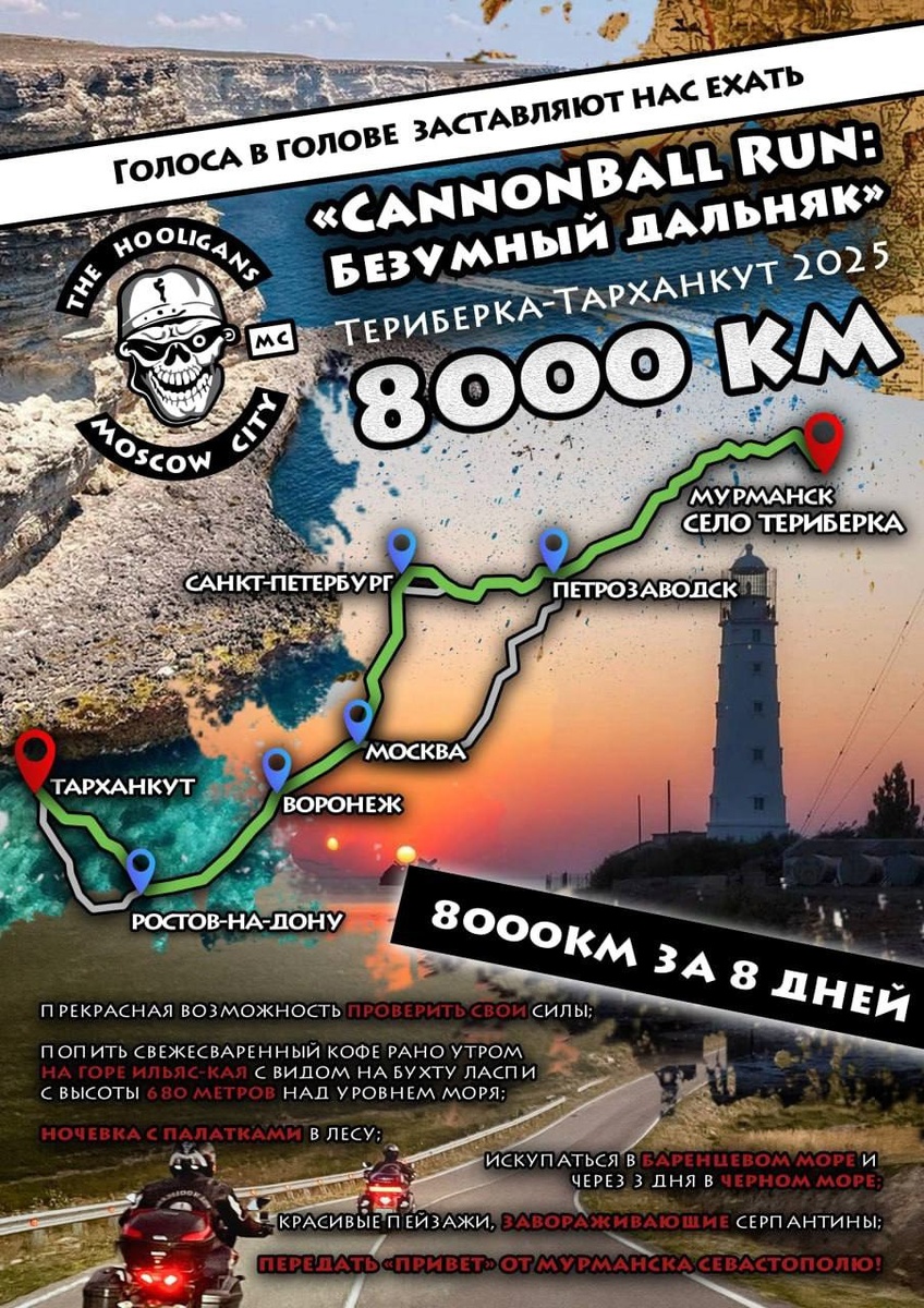 🔁 Дальняк.рф™: Судя по всему это будет сумасшедшая гонка! Представляем Вашему вниманию CannonBall Run 2.0: Безумный Дальняк!!! 18.07.25г. берег Угличского водохранилища Тверской области. Задушевные беседы у костра о предстоящем путешествии и не только. 20.07 приезд в Мурманск, посещение местных достопримечательностей. 22.07 стартуем в сторону Крыма 24.07 приезд на мыс Тарханкут 25.07 отдых на море 26.07 и 27.07 прохваты по красивейшим местам Крыма Ночёвки в палатках и в гостиницах! Все желающие могут присоединиться к пробегу на любом удобном участке!!! (По всем вопросам и подробностям обращайтесь к секретарю