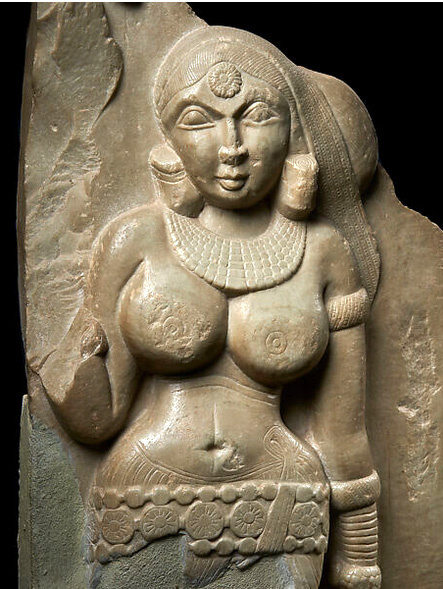 Великая Ступа в Амаравати, в нижнем течении реки Кришна, была величайшим буддийским памятником в регионе южной Индии, известном в древности как Андхрадеша, и имела историю, охватывающую период с третьего века до н. э. по четырнадцатый век н. э. Однако период активного её использования, по-видимому, подошёл к концу в третьем веке н. э. Эта фрагментарная скульптура, обнаруженная во время раскопок, проводившихся на этом месте в 1958-59 годах, может быть отнесена к середине второго века до н. э. Она представляет собой Якши того типа, который можно увидеть в Бхархуте (см. рис. внизу), с близким стилистическим сходством в резьбе, степенью абстракции и чёткостью деталей. Тем не менее, здесь очевиден довольно иной стиль, поскольку, хотя изображение и состоит из таких же кубических форм, в передаче нюансов формы больше тонкости, а контуры более текучи. Поверхность более тактильна, и есть тонкое взаимодействие между деталями украшений и одежды и телом. А поднятое верхнее веко придает опред