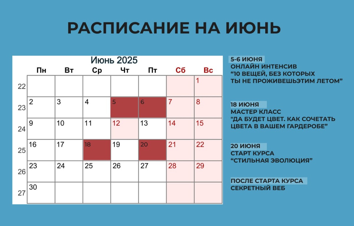 Сохраняйте расписание — будет жарко не только на улице, но и у нас: 📆 5–6 июня ОНЛАЙН-ИНТЕНСИВ «10 вещей, без которых ты не проживёшь этим летом» Что действительно нужно купить, а что — только место занимает. Что брать базовое, а что модное. Словом, будет про вещи, которые работают, а не висят. Подробности про этот двухдневный интенсив уже завтра-послезавтра будут! 📆 18 июня МАСТЕР-КЛАСС «Да будет цвет! Как сочетать цвета в вашем гардеробе» Устали от «серое с белым» или «купила и боюсь носить»? Научу сочетать, чтобы вы управляли цветом, а не цвет — вами. 📆 20 июня СТАРТ КУРСА «СТИЛЬНАЯ ЭВОЛЮЦИЯ» Флагманская программа — для тех, кто хочет перестать путаться в шкафу и начать наконец носить себя уверенно. Под себя. Про себя. Со смыслом. 📆 После старта курса 🤫 СЕКРЕТНЫЙ ВЕБИНАР Тема пока под замком. Но будет 🔥 (и будет доступен только для моих подписчиков) Подписывайтесь на мой канал в телеграм, ставьте напоминалки⏰ и приходите на все активности. Потому что стиль — это не жара в гол