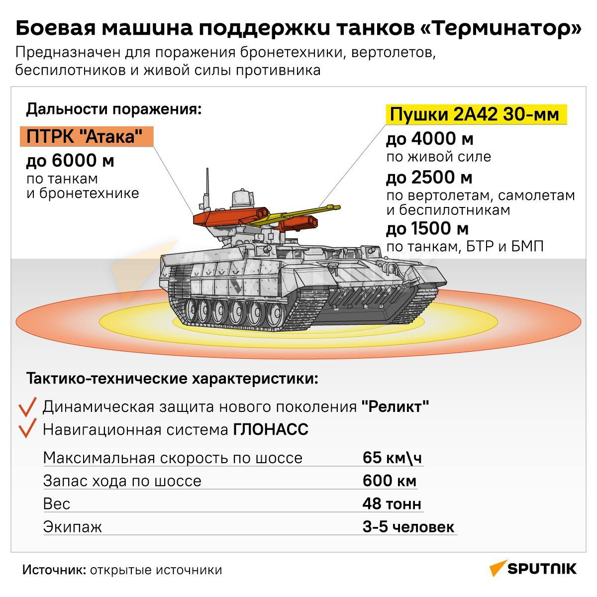 Крещение огнем. "Терминаторы" участвуют в СВО с самого начала конфликта: они прошли через бои за Северодонецк и Лисичанск, обороняли Сватово и Кременную, штурмовали Авдеевку и Курахово. А до этого в 2019 году была Сирия, где БМПТ впервые обкатали в условиях реальных боев. Защищать и уничтожать. Задача танка сводится к поддержке пехоты – расчистить путь, сопроводить солдат до точки высадки и помочь в штурме вражеских позиций. Но кто в этом жёстком мире с гранатометчиками и операторами дронов поможет танкам? Для помощи им в свое время был создан "Терминатор". Шквал огня. "Терминатор" тащит целый арсенал: две спаренные автопушки, пулемет, гранатомет и противотанковые ракеты. Направляет это вооружение современный прицельный комплекс. Защита тоже на высоте: усиленная броня, динамическая защита, а теперь ещё и штатный "мангал" и подавитель дронов.