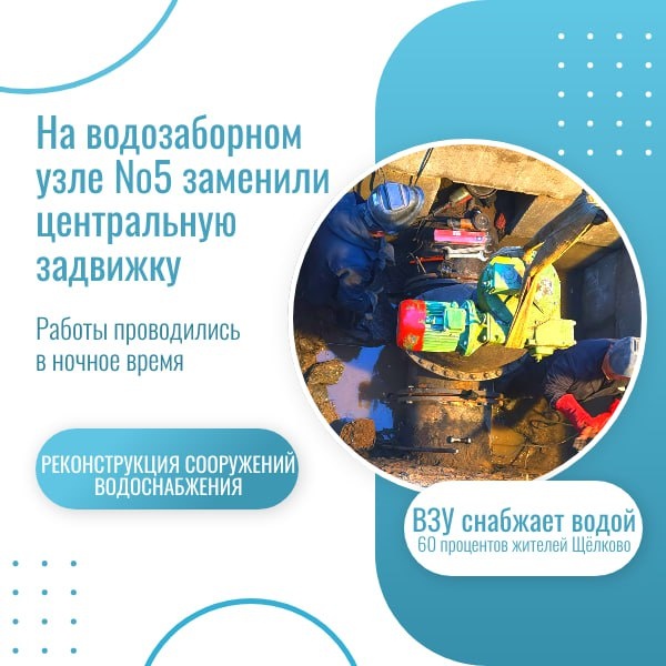 π ΠΠ° ΡΠ°ΠΌΠΎΠΌ ΠΊΡΡΠΏΠ½ΠΎΠΌ ΠΠΠ£ Π©ΡΠ»ΠΊΠΎΠ²ΠΎ Π·Π°ΠΌΠ΅Π½ΠΈΠ»ΠΈ ΡΠ΅Π½ΡΡΠ°Π»ΡΠ½ΡΡ Π·Π°Π΄Π²ΠΈΠΆΠΊΡ Π Π½ΠΎΡΡ Π½Π° 28 ΠΌΠ°Ρ Π½Π° Π²ΠΎΠ΄ΠΎΠ·Π°Π±ΠΎΡΠ½ΠΎΠΌ ΡΠ·Π»Π΅ β5, ΠΊΠΎΡΠΎΡΡΠΉ ΠΎΠ±Π΅ΡΠΏΠ΅ΡΠΈΠ²Π°Π΅Ρ ΠΏΠΈΡΡΠ΅Π²ΠΎΠΉ Π²ΠΎΠ΄ΠΎΠΉ 3/4 ΠΆΠΈΡΠ΅Π»Π΅ΠΉ Π©ΡΠ»ΠΊΠΎΠ²ΠΎ, Π±ΡΠ»Π° ΡΡΡΠ°Π½ΠΎΠ²Π»Π΅Π½Π° Π½ΠΎΠ²Π°Ρ Π·Π°Π΄Π²ΠΈΠΆΠΊΠ° Π½Π° ΡΡΡΠ±ΠΎΠΏΡΠΎΠ²ΠΎΠ΄Π΅. ΠΠ½Π° Π½Π΅ΠΎΠ±Ρ