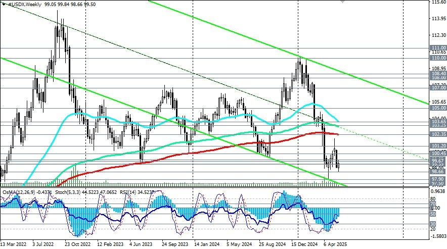 https://basechop.ru/wordpress/?p=44562 Доллар США демонстрирует умеренный рост, продолжая отскок, начавшийся накануне. Рост индекса доллара поддержан ослаблением страхов относительно торговых войн и неожиданно оптимистичными данными по потребительским настроениям. В то же время, фундаментальные риски, включая политическую неопределённость, рост долга и нестабильность доходностей, сохраняются, оказывая давление на доллар, отметили мы в нашем сегодняшнем фундаментальном анализе и обзоре «Доллар: умеренное укрепление – причины и фон». С технической же точки зрения индекс USDX торгуется в зоне краткосрочного, долгосрочного и среднесрочного медвежьих рынков, ниже ключевых уровней сопротивления 99.67 (ЕМА200 на 1-часовом графике), 102.35 (ЕМА200 на недельном графике) и 103.65 (ЕМА200 на дневном графике), соответственно. Ввиду этого, с технической точки зрения, преимущественными тоже пока что остаются короткие позиции. Первым сигналом для новых коротких позиций может стать пробой уровня…