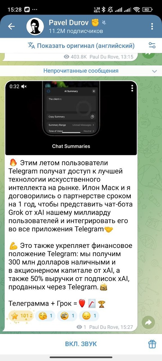 Павел Дуров договорился с Илоном Максом и теперь у нас в телеграме будет встроенный ИИ
