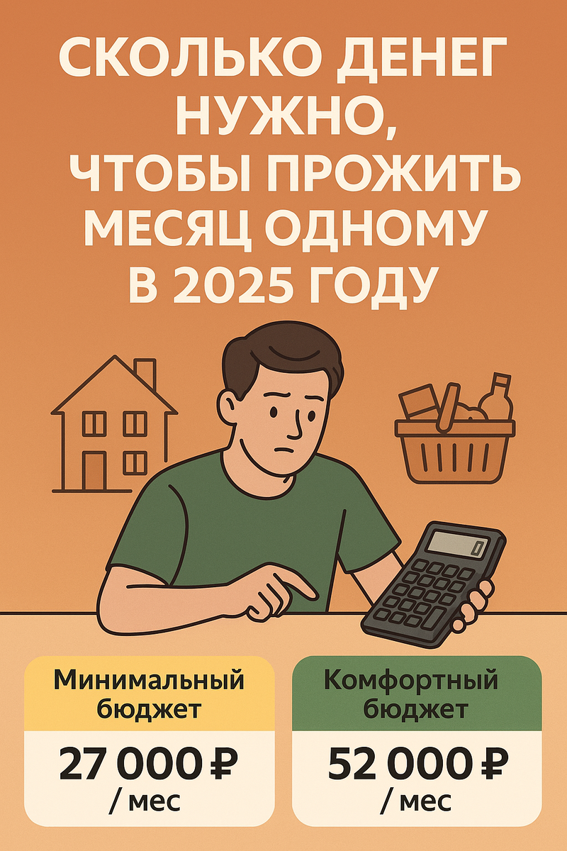 Цены растут, продукты дорожают, аренда подскакивает — и всё же хочется понимать: сколько нужно денег, чтобы прожить месяц в одиночку в 2025 году, не голодая и не сойдя с ума? Я посчитал два варианта — минимальный и комфортный. --- 🟡 Вариант 1: Минимальный бюджет — 27 000 ₽ / мес > Подойдёт студенту, фрилансеру, человеку в поиске 🏠 Аренда комнаты: 12 000 ₽ 🍝 Продукты: 8 000 ₽ 🚇 Транспорт: 1 500 ₽ 📱 Связь + интернет: 600 ₽ 🧴 Бытовая химия и гигиена: 1 000 ₽ ⚡ Коммуналка: 2 000 ₽ ☕ Минимальные развлечения (кофе, кино): 2 000 ₽ 💡 Выжить можно. Но о накоплениях, поездках или нормальном питании — речи почти нет. --- 🟢 Вариант 2: Комфортный бюджет — 52 000 ₽ / мес > Подойдёт офисному работнику или удалёнщику 🏢 Аренда студии: 22 000 ₽ 🍳 Продукты: 12 000 ₽ 🚖 Транспорт/такси: 3 000 ₽ 📶 Связь + интернет: 1 000 ₽ 🧼 Бытовая химия, аптека: 2 000 ₽ ⚡ Коммуналка: 3 000 ₽ 🧘♂️ Досуг, кафе, спорт: 5 000 ₽ 📦 Прочее (непредвиденные расходы): 4 000 ₽ 💡 Это