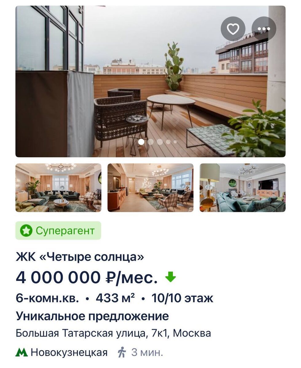 🔶 Москва вновь бьет рекорды: самый дорогой вариант аренды сейчас — это шикарный пентхаус с эксклюзивным ремонтом в Замоскворечье, его