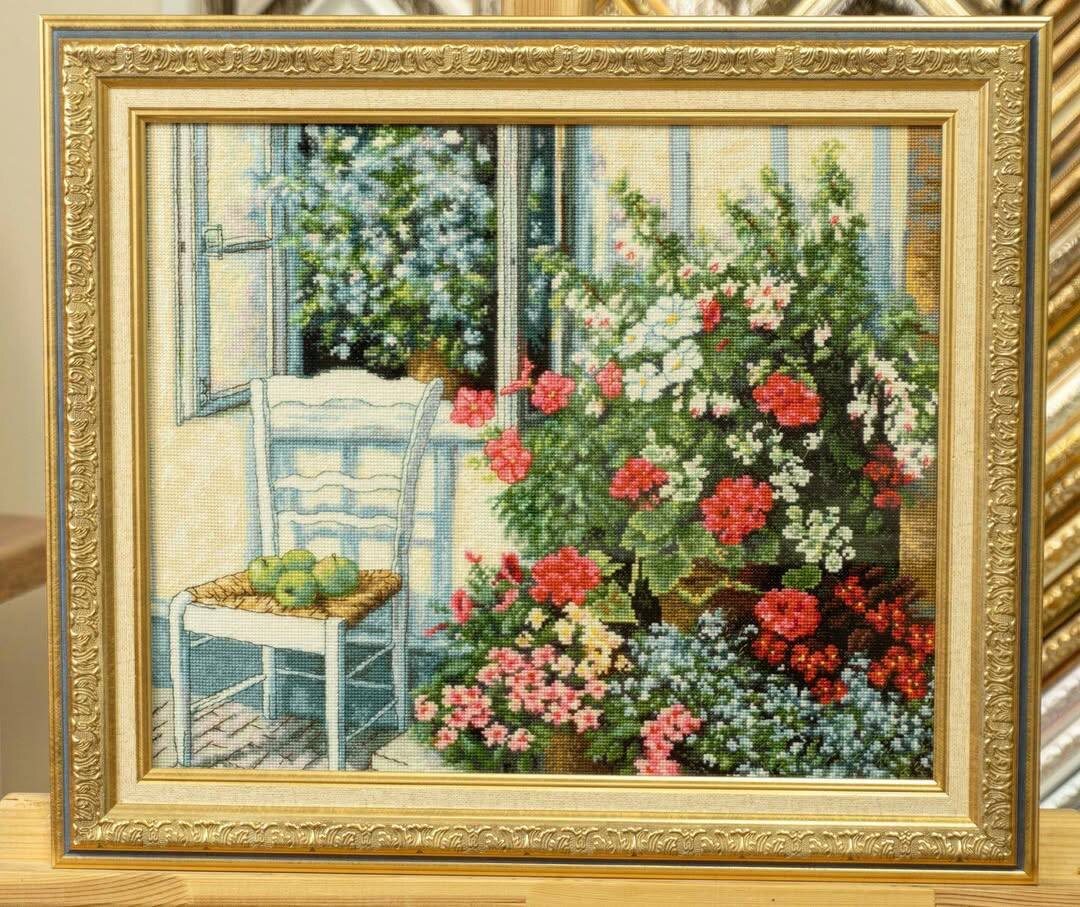 Оформили в нарядный пластиковый багетик с голубой полосочкой. Золотинка отлично подчеркивает летний пейзаж! Очень жизнерадостный сюжет! 😍