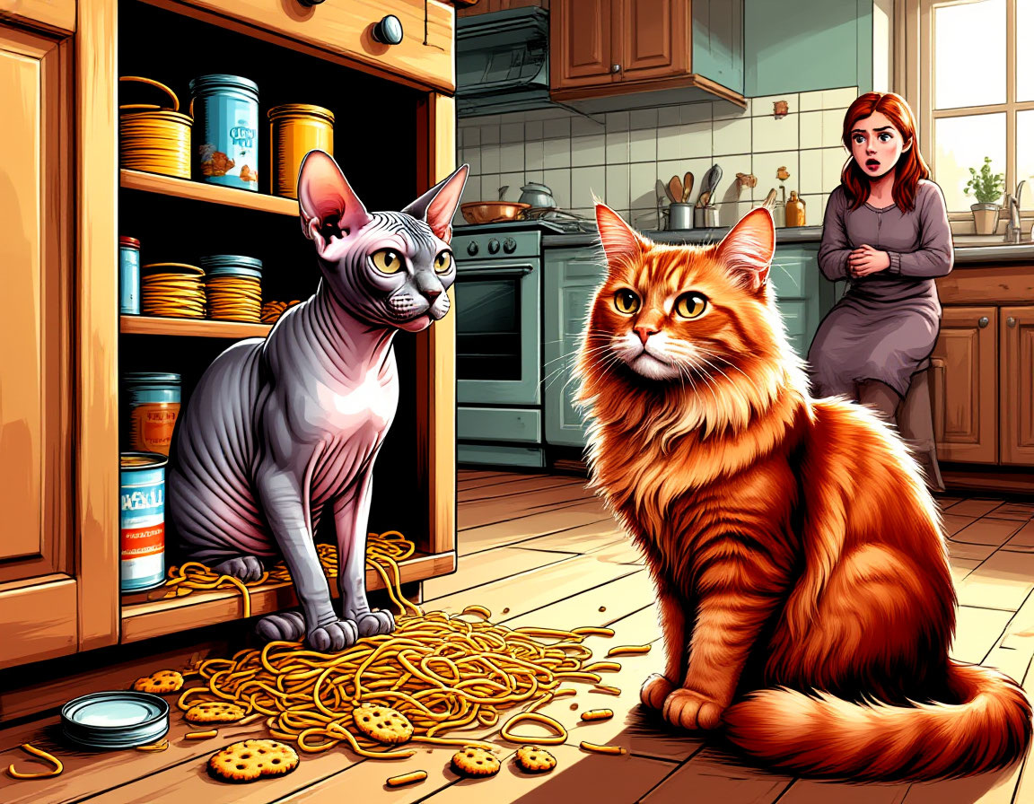 Утро начиналось мирно. Грета лежала на подоконнике и как обычно выглядела так, будто читает философский трактат о величии кошачьей натуры. В это время Гектор исподтишка крался по кухне. — Грета, ты заметила? — зашептал он, высунув голову из-за мусорного ведра. — Хозяйка каждый день что-то прячет в нижнем шкафу. Она делает это подозрительно. С видом заговорщицы. Мне кажется… там закопано сокровище. — Ага, сокровище, — протянула Грета. — Наверное, твои мозги, потому что ты их где-то явно оставил. Но Гектор был неумолим. Он выждал момент, когда хозяйка вышла из кухни с чашкой чая, и молниеносно прыгнул на табурет. С табурета — на тумбочку, с тумбочки — головой в открывшийся шкаф. Влетел с таким размахом, что посыпались макароны, пачка риса и какой-то подозрительно легкий контейнер с крышкой. Контейнер с грохотом вывалился на пол, раскрылся, и… из него выпали сухарики. Обычные, чесночные сухарики. Гектор завис. Он ожидал золото. Или хотя бы тунца. — Сокровище, говоришь? — сухо прокомменти