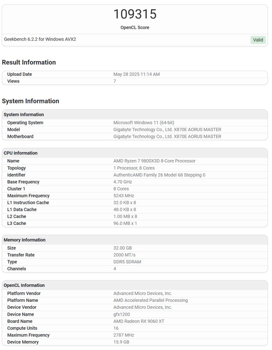 В Geekbench появились данные AMD Radeon RX 9060 XT — новой видеокарты среднего класса на базе чипа Navi 44. RX 9060 XT показала 109 315 баллов в OpenCL и 124 251 в Vulkan. Это примерно на 25–31% быстрее, чем RX 7600 XT, но уступает NVIDIA RTX 5060 Ti, которая в аналогичных тестах набирает 138 869 и 133 861 балл соответственно. Разрыв составляет около 21% в OpenCL и 7% в Vulkan — не в пользу новинки от AMD. Тестирование проводилось на системе с Ryzen 7 9800X3D и материнской плате AORUS X870E Master. Хотя Geekbench и не отражает реальную игровую производительность, эти данные дают первое представление о вычислительном потенциале карты. Подробные обзоры и игровые тесты ожидаются на следующей неделе.