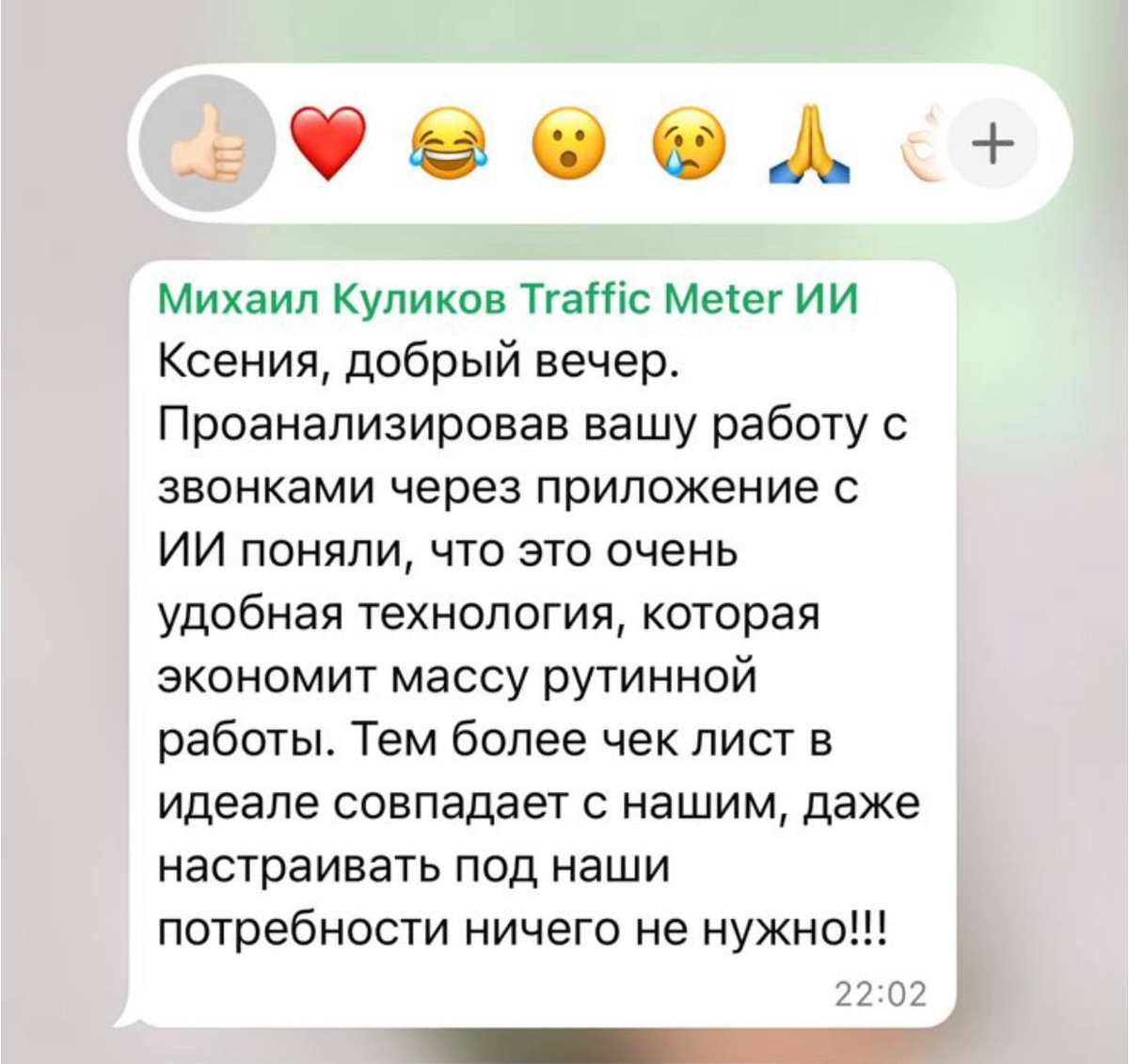 Прошло меньше месяца как МИР запустил ИИ-анализ телефонных продаж для мебельных компаний - Traffic Meter (TM). На эту минуту тестируют сервис несколько малых розничных бизнесов и одна миллиардная фабрика. ——————— И вот что они от туда забирают себе в работу по усилению качества своих телефонных продаж и работы с лидами. Так сказать, позвольте «оголиться» и показать внутрянку сервиса ⬇️⬇️⬇️ [Смотреть pdf с разбором загруженного звонка] Так выглядит результат анализа 👆 - подробно, объективно и с мебельной спецификой. ——————— ℹ️В оценке участвуют 9 ключевых критериев и это не только классические 5 этапов продаж. Внутри каждого из них анализируются: и построение фраз, и наличие нужных вопросов, усилений, намерений продавца, и ответы клиента. Всё имеет вес. Всё приводит к продажам или … убивает их. ✔️На основании этого анализа собственник, руководитель продаж или сами продавцы работают над своими скриптами, дорабатывают их и снова тестируют, прогоняя записи через сервис. Они сразу видят