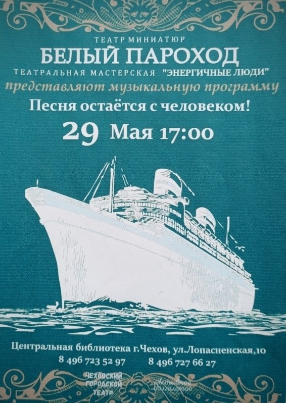 ✨ Музыкальная программа «Песня остаётся с человеком» 🎶Артисты театра миниатюр «Белый пароход» и театральной мастерской «Энергичные люди» подготовили небольшой концерт с лучшими песнями. 🤗Ждём всех 🚫 Возраст: 6+ 📆 29.05.2025 🕛 17:00 🏢 Центральная библиотека 📍 г. Чехов, ул. Лопасненская, д.10 🪙 Вход свободный❗️ #webЧехов ✅ Мероприятия Чехов https://dzen.ru/id/66cc4b48e9ef144699238a51 http://vk.com/chekhov_events http://dzen.ru/chekhov_events