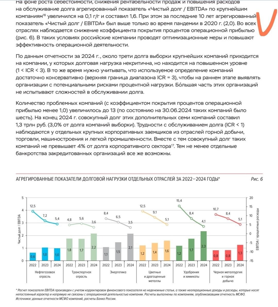 Факторы роста долговой нагрузки у крупных компаний. От нашего ЦБ из Обзора финансовой стабильности № 1 (26) • IV квартал 2024 – I квартал 2025 года: "При этом за последние 10 лет агрегированный показатель «Чистый долг / EBITDA» был выше только во время пандемии в 2020 г. (2,0). Во всех отраслях наблюдается снижение коэффициента покрытия процентов операционной прибылью (рис. 6). В таких условиях российские компании проводят оптимизационные меры и повышают эффективность операционной деятельности." 👉Рынок немного одурел сейчас уже даже с лёгкой прикормки о "разнообразии вариантов решения по ставке и сигналу" через пару недель 🤡 По факту имеем пока лишь бодрый отскок на нисходящем тренде, т.е. шортовынос. Ставку, безусловно, давным-давно пора снижать.