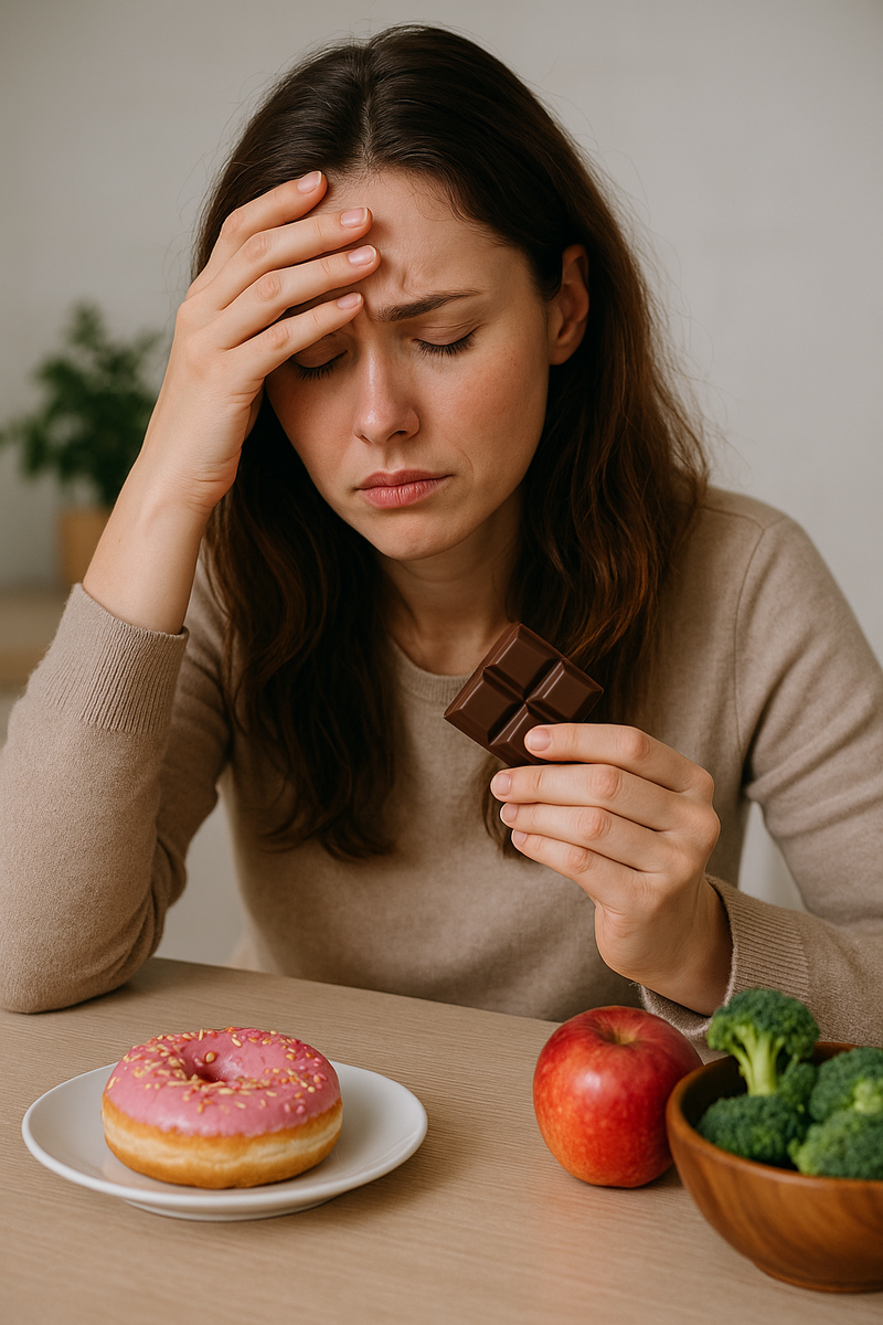 Вы замечали, что в напряжённые периоды рука тянется к шоколадке, выпечке или чему-то жирному? Это не слабость воли — это работа кортизола. Гормона, который влияет на аппетит, пищевые привычки и даже вашу фигуру. Кортизол — это гормон стресса. Он вырабатывается надпочечниками, когда организм ощущает угрозу. Он помогает выжить: повышает уровень глюкозы, активирует симпатическую нервную систему. Но если стресс хронический — кортизол становится источником проблем: Кортизол активирует механизмы выживания, и мозг требует быстрый источник энергии — сахар. При этом сладкое временно снижает тревожность за счёт дофамина, но затем усиливает эмоциональные колебания. Возникает замкнутый круг: стресс → сладкое → скачок сахара → падение → тревожность → снова стресс. 1. Восстановите режим. Регулярные приёмы пищи снижают уровень кортизола и стабилизируют сахар в крови. 2. Добавьте продукты-антистресс: 3. Уменьшите стимуляторы: Ограничьте кофе, сахар, энергодобавки — они усиливают колебания кор