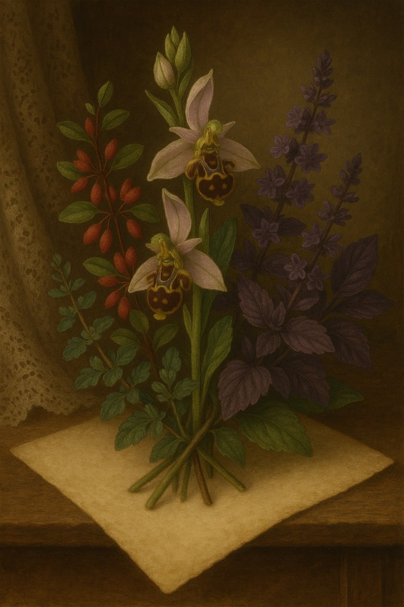 Хотите потренироваться в викторианском искусстве общения цветами? Салли получила от одного юноши букет из пчелиной орхидеи, базилика и веточек барбариса. Как вы думаете, что он хотел сказать? Чтобы понять это, подумайте о свойствах каждого растения или об ассоциациях с его названием.