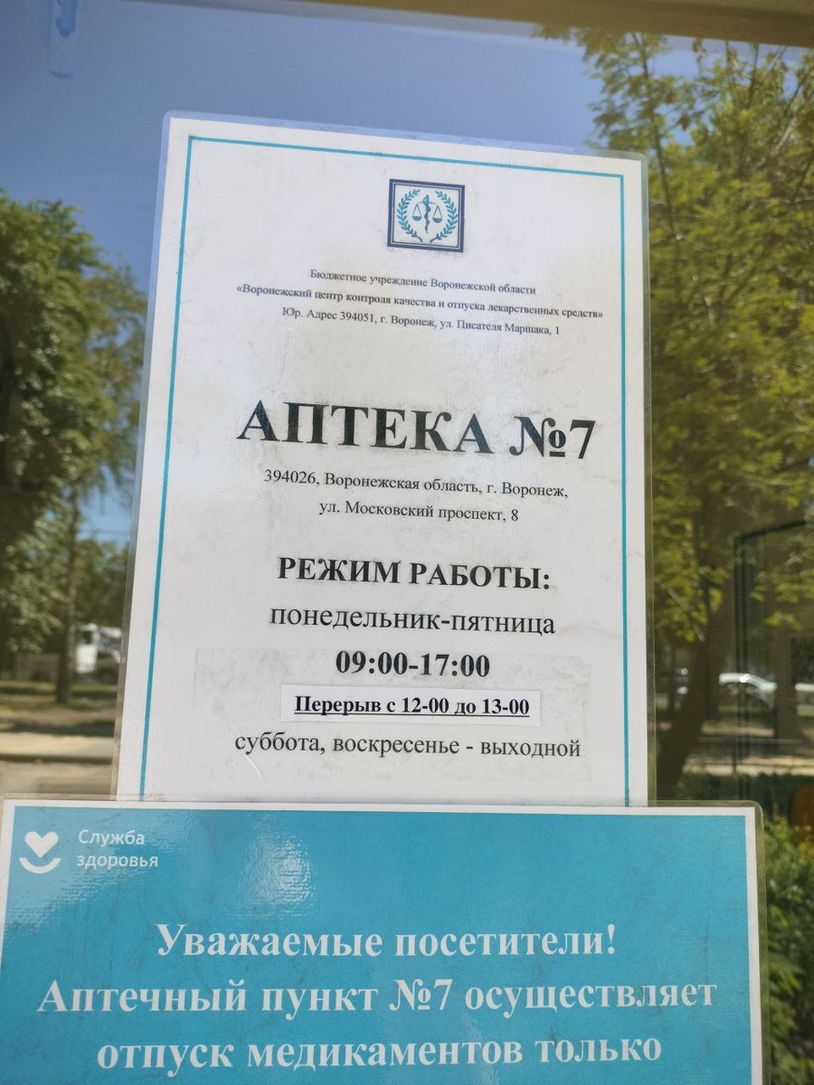 Воронежцев возмущает, что график аптеки и так с 9 до 17, так ее еще и закрывают на час перерыва.
