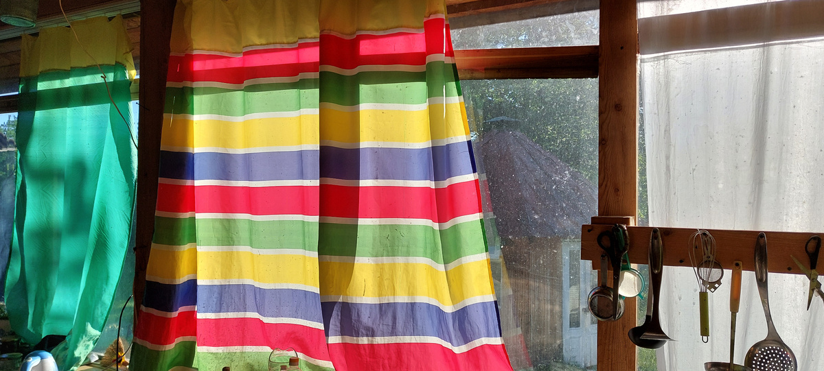А так-то тюль в мелкий рисунок почти всегда "отсылает к деревенской и загородной теме". Да и она будет именно белая. Возможно, что после моих сегодняшних "учебных пособий по цветам спектра для внуков" на окнах нашей веранды, она как-то смелее сорганизует наше пространство, ну, хотя бы немного иначе.