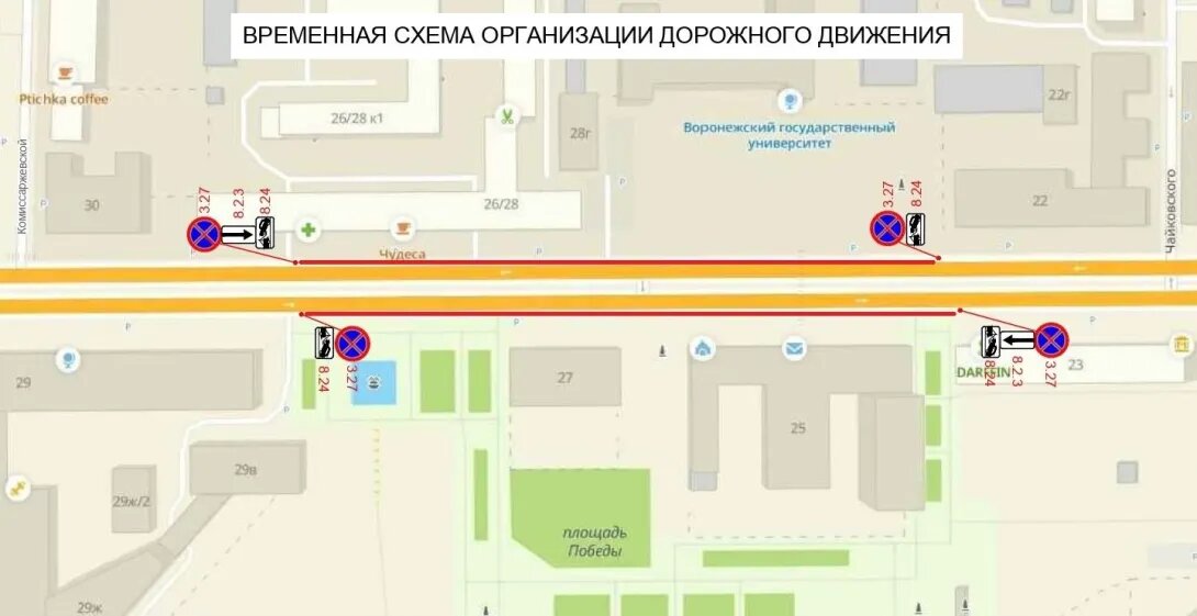Парковку около памятника Славы в Воронеже запретят в четверг, 29 мая, а возле площади Победы – в пятницу, 30 мая. Об этом горожан сегодня предупредили в пресс-службе городского управления дорожного хозяйства. Завтра на участке рядом с мемориальным комплексом нельзя будет оставлять машины и даже останавливаться из-за проведения торжественного мероприятия. Запрет будет действовать в течение девяти часов – с 6.00 до 15.00. Пятничные ограничения в центральной части города связаны с церемонией возложения цветов к Могиле неизвестного солдата. Они будут введены на участке проспекта Революции от дома №29 до дома №23 и от дома №22 до дома №30 на шесть часов – с 7.00 до 13.00. Воронежцам приносят извинения за неудобства и просят заранее учитывать озвученную информацию при планировании своего маршрута. Схемы – управление дорожного хозяйства.