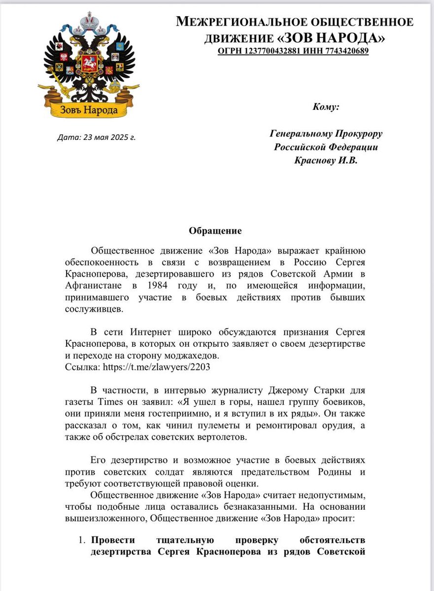 π’ Π£Π²Π°ΠΆΠ°Π΅ΠΌΡΠ΅ ΠΏΠΎΠ΄ΠΏΠΈΡΡΠΈΠΊΠΈ! Π― ΠΎΠ±ΡΠ°ΡΠ°ΡΡΡ ΠΊ Π²Π°ΠΌ Ρ Π²Π°ΠΆΠ½ΡΠΌ ΡΠΎΠΎΠ±ΡΠ΅Π½ΠΈΠ΅ΠΌ. ΠΠ°ΠΊΠ°Π½ΡΠ½Π΅ Ρ Π½Π°ΠΏΡΠ°Π²ΠΈΠ» ΠΎΠ±ΡΠ°ΡΠ΅Π½ΠΈΠ΅ Π² ΠΏΡΠΎΠΊΡΡΠ°ΡΡΡΡ, Π²ΡΡΠ°ΠΆΠ°Ρ ΡΠ²ΠΎΡ ΠΊΡΠ°ΠΉΠ½ΡΡ ΠΎΠ±Π΅ΡΠΏΠΎΠΊΠΎΠ΅Π½Π½ΠΎΡΡΡ Π² ΡΠ²ΡΠ·ΠΈ Ρ Π²ΠΎΠ·Π²ΡΠ°ΡΠ΅Π½ΠΈΠ΅ΠΌ Π² Π ΠΎΡΡΠΈΡ Π‘Π΅ΡΠ³Π΅Ρ ΠΡΠ°ΡΠ½ΠΎΠΏΠ΅ΡΠΎΠ²Π°. ΠΡΠΎΡ ΡΠ΅Π»ΠΎΠ²Π΅ΠΊ Π΄Π΅Π·Π΅ΡΡΠΈΡΠΎΠ²Π°Π» ΠΈΠ· ΡΡΠ΄ΠΎΠ² Π‘ΠΎΠ²Π΅ΡΡΠΊΠΎΠΉ ΠΡΠΌΠΈΠΈ Π²ΠΎ Π²ΡΠ΅ΠΌΡ Π°ΡΠ³Π°Π½ΡΠΊΠΎΠΉ Π²ΠΎΠΉΠ½Ρ Π² 1984 Π³ΠΎΠ΄Ρ ΠΈ, ΡΠΎΠ³Π»Π°ΡΠ½ΠΎ ΠΈΠΌΠ΅ΡΡΠ΅ΠΉΡΡ ΠΈΠ½ΡΠΎΡΠΌΠ°ΡΠΈΠΈ, ΠΏΡΠΈΠ½ΠΈΠΌΠ°Π» ΡΡΠ°ΡΡΠΈΠ΅ Π² Π±ΠΎΠ΅Π²ΡΡ