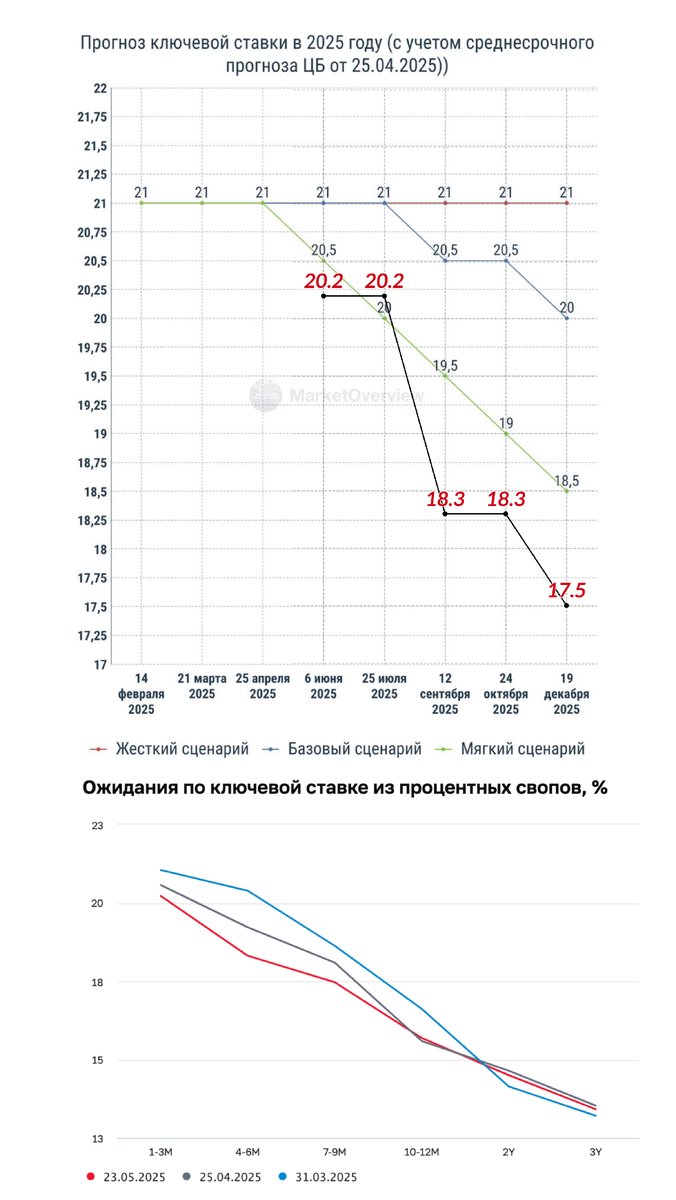 3 мая строили прогноз по ключевой ставке с учетом данных из"Резюме обсуждения ключевой ставки" и нового "Комментария к среднесрочному прогнозу Банка России". Добавим на график "Ожидания по ключевой ставке из процентных свопов" от 23.05.2025 и снижение ключевой ставки становится быстрей самого "мягкого" прогноза. Ориентироваться на них дальше 1-3 месяцев, само собой, не стоит, но ближайшее заседание 6 июня похоже будет с хорошими новостями. На текущих уровнях снижение по 0,25% выглядит странным, но глава комитета Госдумы по финансовому рынку Анатолий Аксаков может оказаться прав: Допускаю, что на заседании 6 июня ЦБ примет решение снизить ключевую ставку на 0,25%. Последние данные показывают, что инфляция снижается. Правда против такого решения может сработать расширение дефицита бюджета. 🎁 Напомним, что у нас проходит конкурс по ключевой ставке, курсу доллара и банку с розыгрышем 10 призов - ответы принимаются исключительно в комментариях к посту https://t.me/MarketOverview/15974 Ma