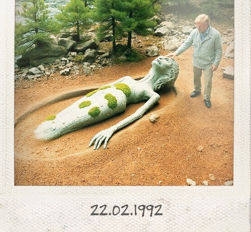 В 92-м году те старатели обнаружили огромную каменную фигуру какого-то существа с длинными руками, курчавыми волосами и открытым ртом, словно в гримасе ужаса. Поначалу думали, что это просто обычная каменная скульптура, но при детальном изучении учёные были в полном недоумении. Оказывается, верхняя гипсосодержащая поверхность — это лишь начало, и эту поверхность, эту скульптуру, делала уже другая цивилизация. Неизвестно, по каким причинам они хотели создать подобный образ: может быть, хотели, чтобы он был для них каким-то божеством, или просто поглубже спрятать то, что было внутри. А внутри этой скульптуры была похожая один в один скульптура, только она уже была сделана из прочного материала — металла, похожего по своим свойствам на титан, но имеющего ещё какие-то неизвестные примеси.