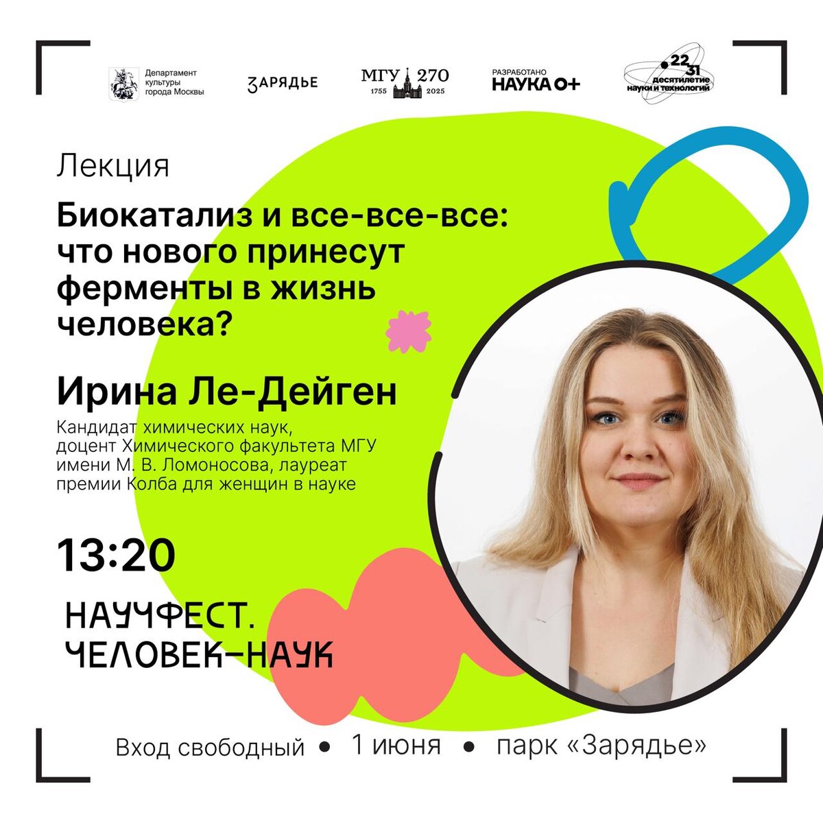 Биокатализ и все-все-все: что нового принесут ферменты в жизнь человека? 1 июня в 13:20 кандидат химических наук, доцент химического факультета МГУ имени М. В. Ломоносова, лауреат премии Колба для женщин в науке Ирина Ле-Дейген прочитает лекцию «Биокатализ и все-все-все: что нового принесут ферменты в жизнь человека?» Ферменты — практически совершенные биокатализаторы, которые служат человеку не только внутри нашего собственного организма, но и во многих биотехнологических процессах. От новых лекарств и космических технологий до вкусной еды и комфортных тканей — везде помогают ферменты. А что нового нас ждет в 21 веке? И какие открытия смогут совершить гости нашего научного фестиваля? Лекция состоится 1 июня, в День защиты детей, в парке «Зарядье», в рамках масштабного фестиваля «НАУЧФЕСТ. Человек-наук» в зоне НеЛектория. Смотрите полную программу мероприятий на сайте. Для тех, кто не сможет посетить фестиваль лично, будет организована онлайн-трансляция на платформе VK видео по ссы