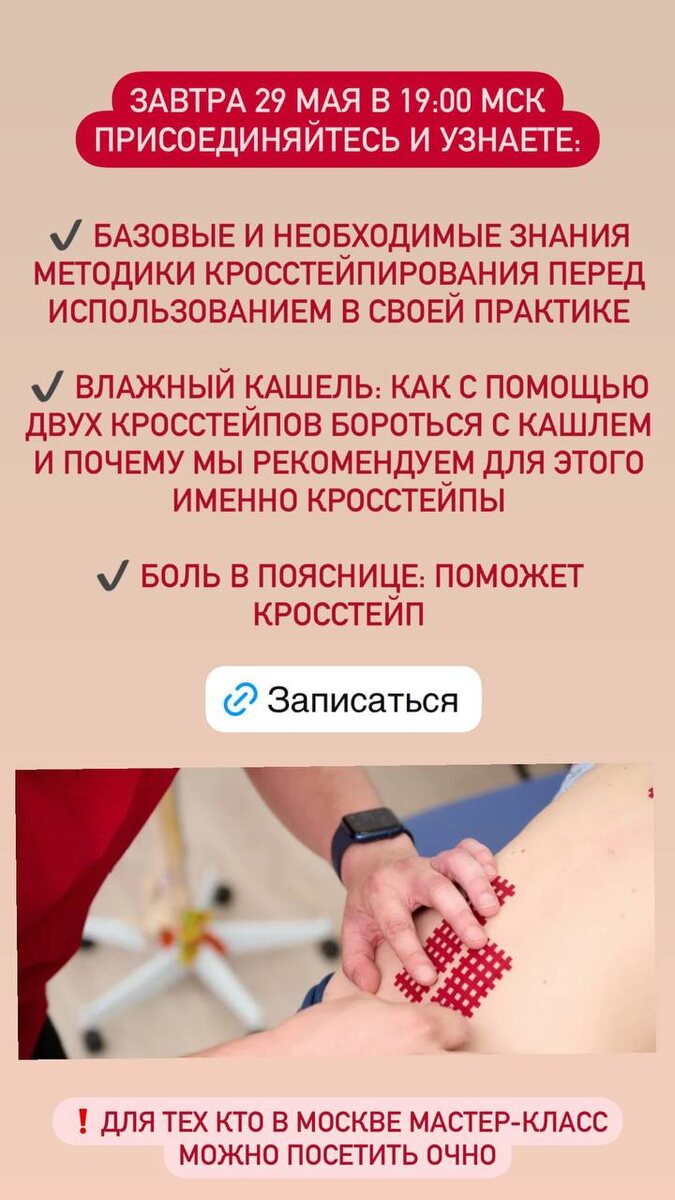⚠️⚠️⚠️⚠️ ЗАВТРА! ✨ 29 мая в 19:00 по МСК приглашаем вас на бесплатный мастер-класс «Знакомство с кросстейпированием». Это возможность узнать новые техники и посмотреть на экспертов Учебного центра в деле 🔥 Вы узнаете: ❗️ Базовые и необходимые знания методики кросстейпирования перед использованием в своей практике. ❗️ Влажный кашель: как с помощью двух кросстейпов бороться с кашлем и почему мы рекомендуем для этого именно кросстейпы. ❗️ Боль в пояснице: поможет кросстейп. Для участия в мастер-классе регистрируйтесь прямо сейчас по ❗️ссылке ❗️Для тех кто в Москве мастер-класс можно посетить очно.