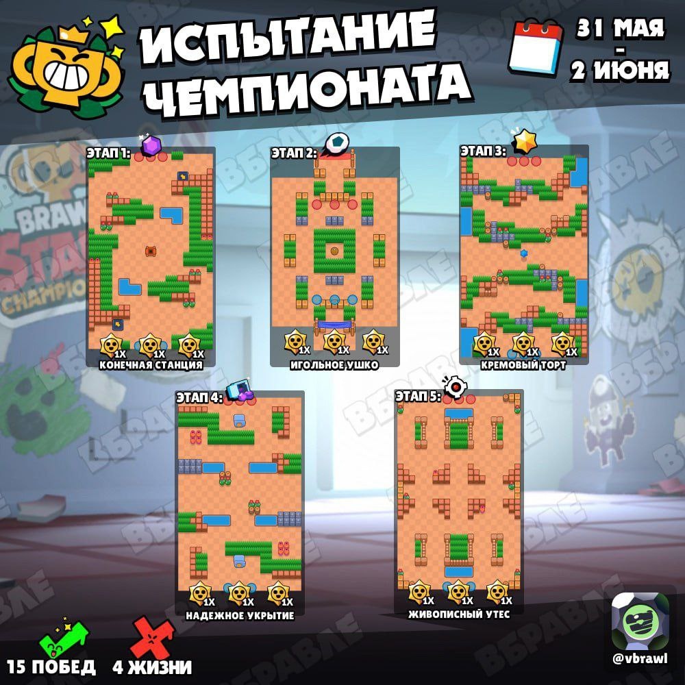 ⚡️Карты предстоящего Испытания Чемпионата Чтобы одержать победу, необходимо выиграть 15 раз. За каждую победу вы получите 1 случайный Приз Старр. Допустимо до 4 поражений Мир Supercell. Подписаться
