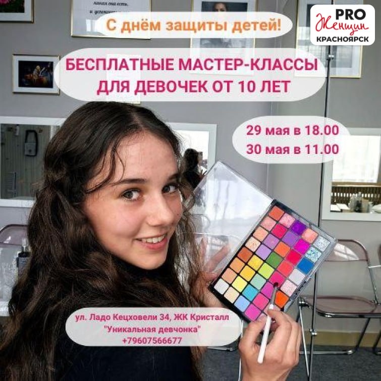 📦 Дорогие мамы девочек 29 и 30 мая лидер сообщества PRO Женщин Наталья Калиниченко проведёт бесплатные мастер-классы по макияжу для девочек 10-16 лет ❤️ Это её подарок в честь "Дня защиты детей" Обучение пройдёт без нравоучений, просто, красиво, интересно Что будет на МК: 🦋 Поговорим про то, зачем вообще макияж 🦋 Научимся делать лёгкие акценты: блеск, румяна, немного блёсток 🦋 Покажу, как подчеркнуть естественную красоту, а не прятать её 🦋 и главное — поговорим про уверенность в себе, с которой хочется расти Выбирайте удобное время: 📆 29 мая в 18:00-19:00 📆 30 мая в 11:00-12:00 🎁 Участие бесплатное 🏡 г.Красноярск, ул. Ладо Кецховели 34, ЖК Кристалл, этаж 2, школа "Уникальная девчонка" Если вы чувствуете, что это нужно вашей девочке — напишите лидеру Наталье Калиниченко в лс @Natalia_kalinichenko77 Пусть этот час станет для неё особенным ⭐️ Подготовила визуал и пост Наталья Калиниченко Оформила пост Ольга Колесникова