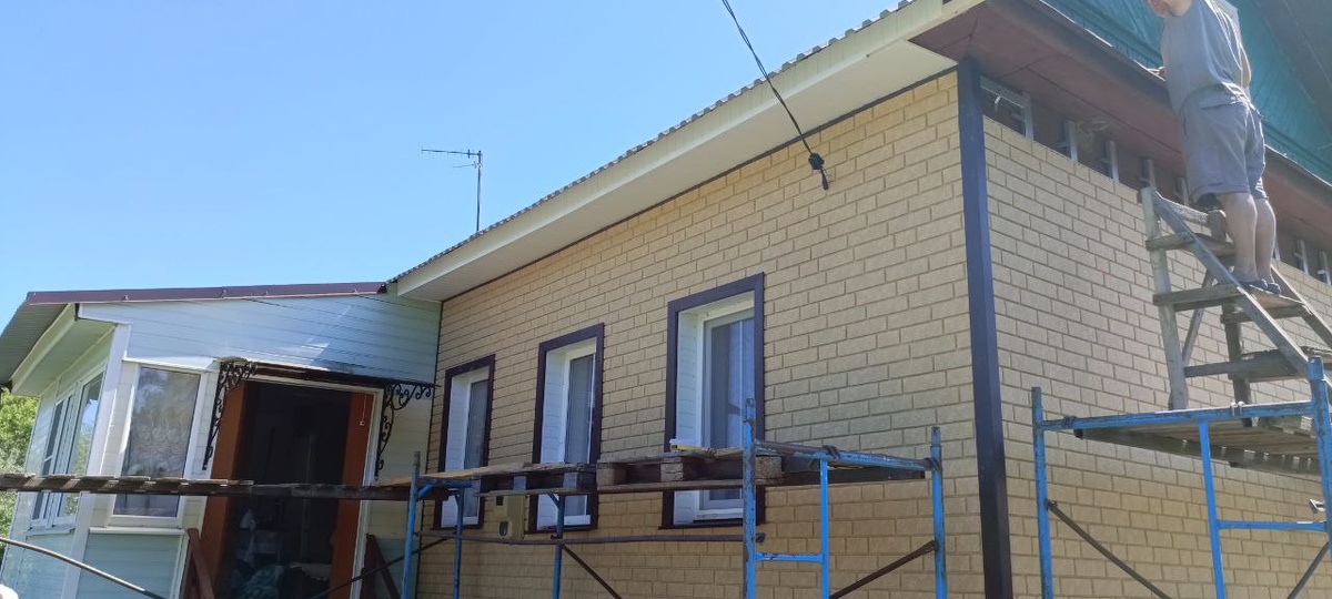 Рабочий vlog/сегодняшний третий день на этом объекте.... За сегодня дошили сайдингом лицевую часть дома и обшили паллет на двух сторонах. И на второй стене дошили сайдинг до полки.... И выраанили под отлив на франтоне козырёк.