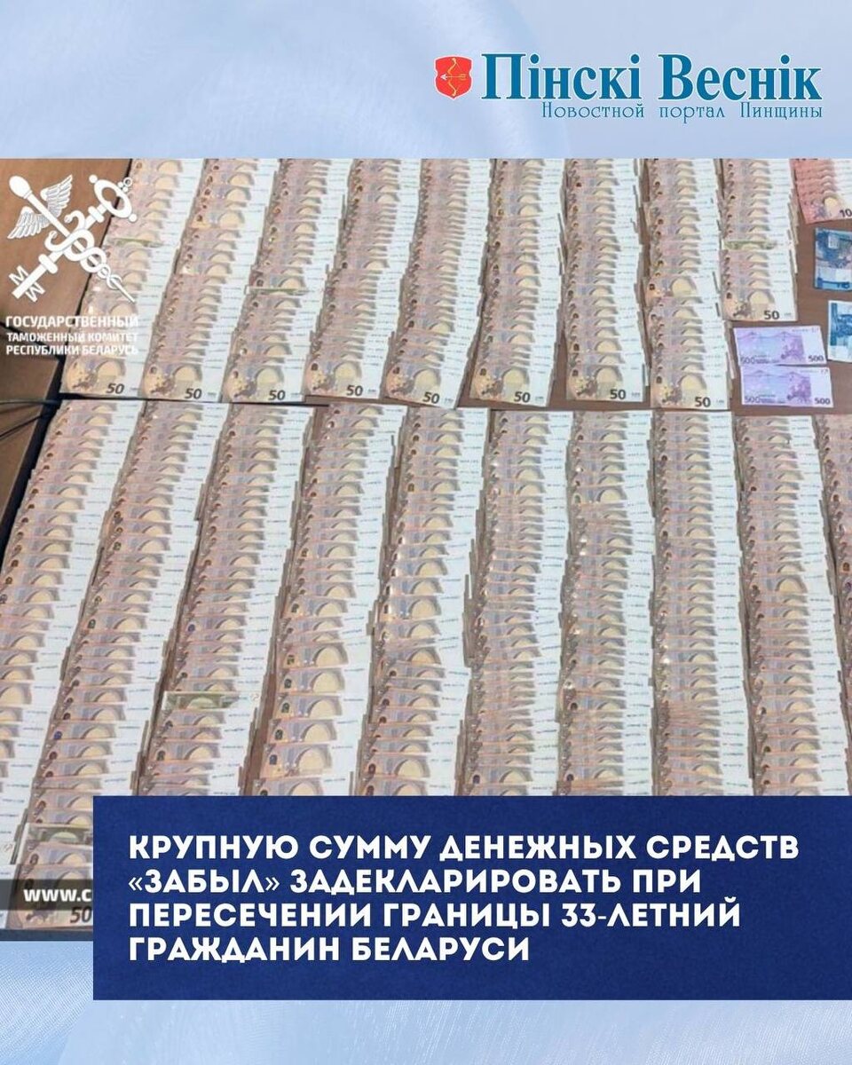 ✔️33-летний гражданин Беларуси, возвращаясь из Польши на рейсовом автобусе «Познань-Гомель», попытался «забыть» задекларировать крупную сумму денег при пересечении границы. 🖇️Таможенники обнаружили у него 31 тысячу евро в карманах куртки и более 6,5 тысячи евро в рюкзаке, что составляет около 42 тысяч долларов. Это на 32 тысячи больше допустимой суммы для перемещения без декларирования. 🖇️В отношении него было возбуждено уголовное дело. Валюта изъята до решения суда. Будьте внимательны и соблюдайте закон! 📍📍@Пинский Вестник ЮТУБ | САЙТ| ИНСТ | ВК | ОК | ФЕ | Прислать новость
